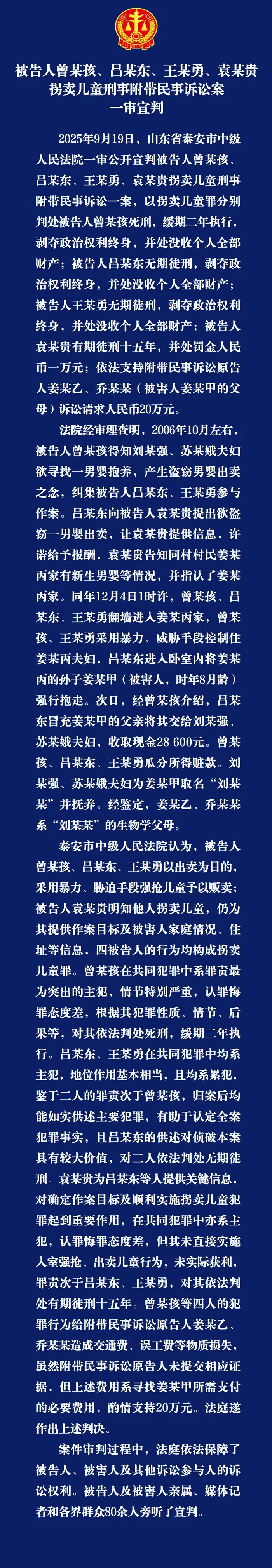 山东泰安“入室抢婴案”一审宣判,4名被告最高获死缓