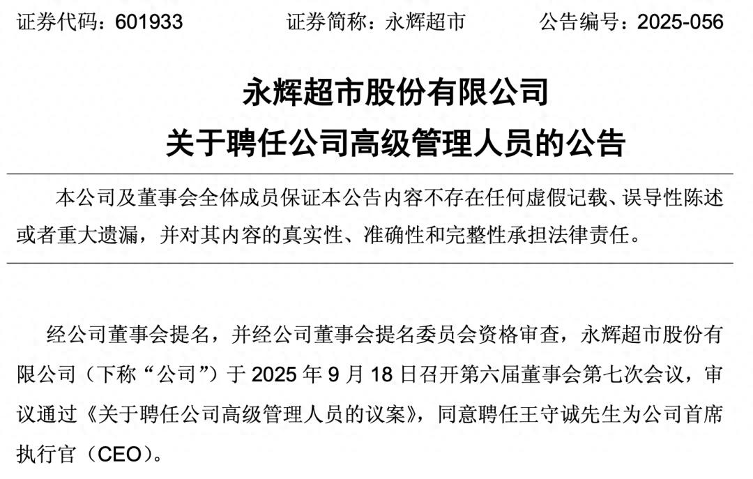 9月18日,永辉超市(601933.SH)发布公告称,经公司董事会提名,并经公司董事会提名委员会资格审查,永辉超市于9月18日召开第六届董事会第七次会议,审议通过《关于聘任公司高级管理人员的议案》,同意聘任王守诚为公司首席执行官(CEO)。