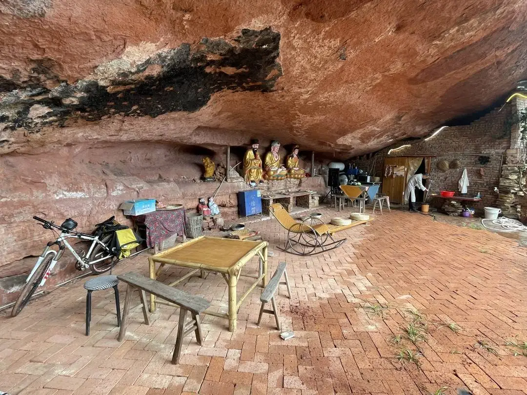 封面新闻记者在现场看到,几间“房间”仅仅是用红砖墙隔开,“天花板”是崖壁,几扇“窗户”砌成太阳、月亮、星星的造型,正门上方写有“黑洞”两字;一扇木门虚掩,上书“独善其身”四个红字,格外惹眼。