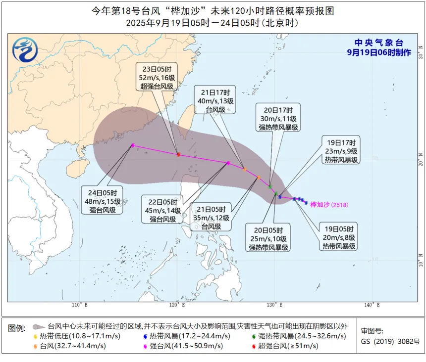 原位于菲律宾以东洋面的热带低压已于18日20时加强为今年第18号台风“桦加沙”(热带风暴级,英文名:Ragasa,名字来源:菲律宾,意义:快速移动)。