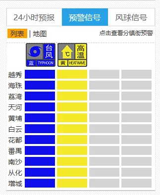 目前广州各区台风蓝色预警信号已生效,广州港1-2号港区台风3号风球、3-4号港区台风2号风球正在生效。