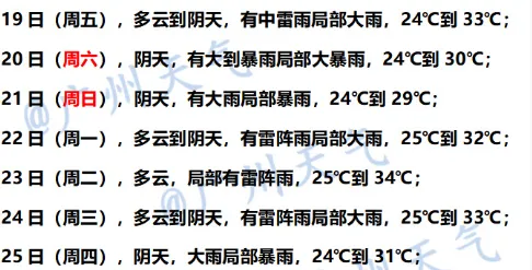 据广州天气预测, 广州市19-21日有一次暴雨局部大暴雨降水过程,陆地风力加大至6~9级,港区和高地风力8~10级。
