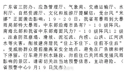 记者获悉,鉴于今年第17号台风“米娜”进一步增强,并即将正面登陆广东省。根据《广东省防汛防旱防风防冻应急预案》和省防总有关规定,省防总已于9月19日10时将防风Ⅳ级应急响应提升为防风Ⅲ级应急响应。