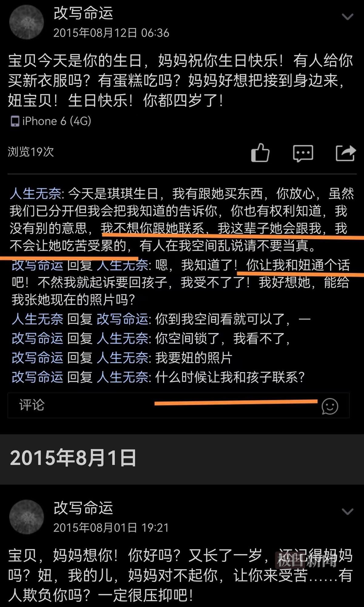 此后,两人只能通过社交软件远程联络。白女士曾多次在社交软件上公开表达对孩子的想念,但刘工表示“我不想你跟她(孩子)联系,我这辈子她会跟我,我不会让她吃苦受累的”,白追问:“什么时候让我和孩子联系?”刘却不回应。