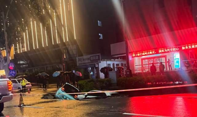 现场视频显示,塌陷处呈圆形,一辆白色SUV完全陷入坑中,另一辆蓝色微型电动车右侧坠入,车身倾斜。