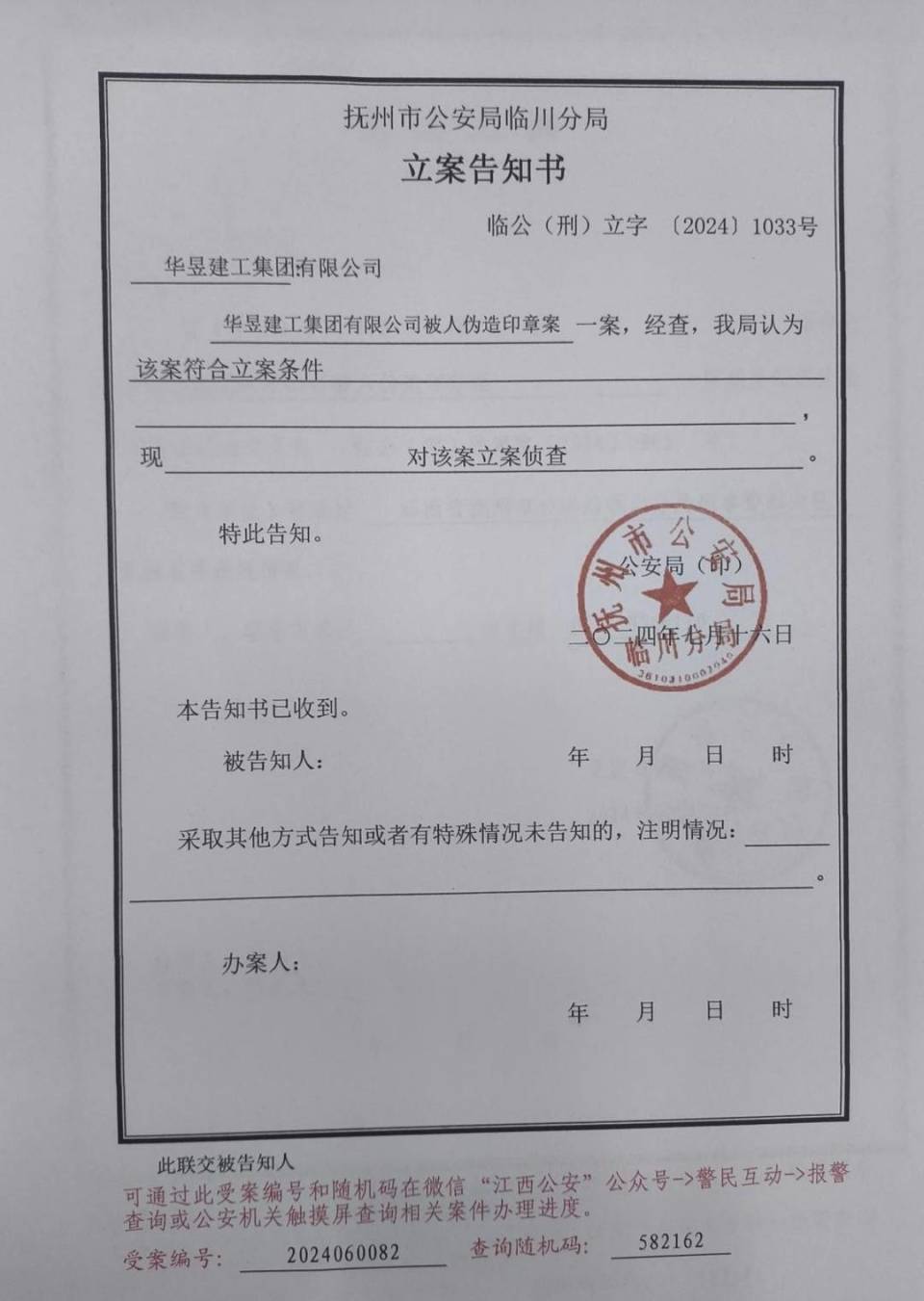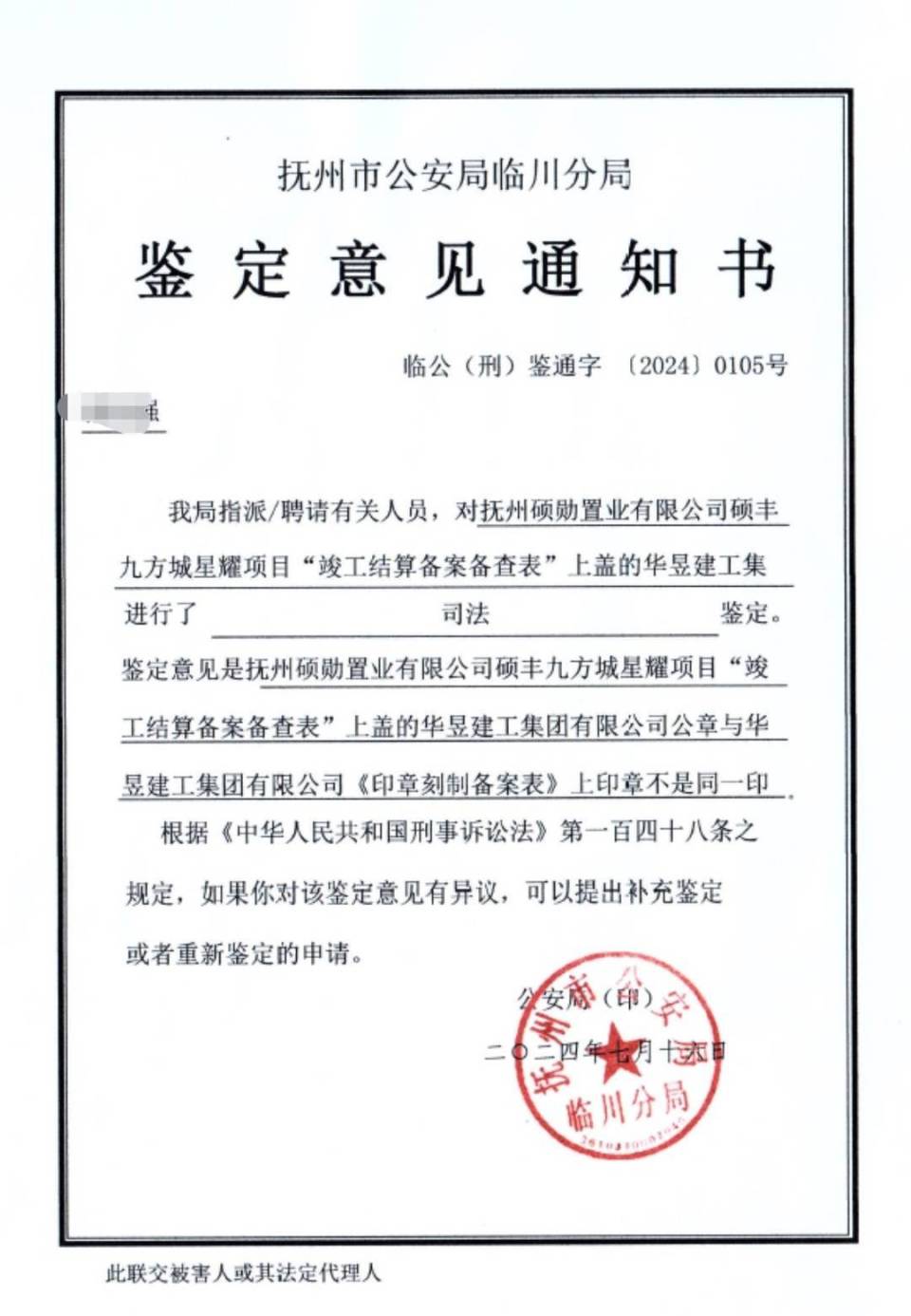 2024年7月16日,抚州市公安局临川分局经过司法鉴定,确认《竣工结算备案备查表》中施工方的公章,与实际公章不是同一枚。同日,该局对这起伪造印章案正式立案侦查。