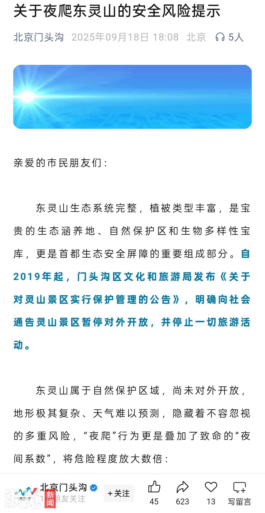 记者查询发现,9月17日,门头沟区清水镇人民政府、文旅局等5家单位曾联合发布《关于严禁游客擅自进入东灵山开展穿越、攀登等活动的安全提示》(下称《提示》)。9月18日,门头沟区清水镇人民政府联合门头沟文旅局再次发布《关于夜爬东灵山的安全风险提示》。《提示》中写道:自2019年起,门头沟区文化和旅游局发布《关于对灵山景区实行保护管理的公告》,明确向社会通告灵山景区暂停对外开放,并停止一切旅游活动。