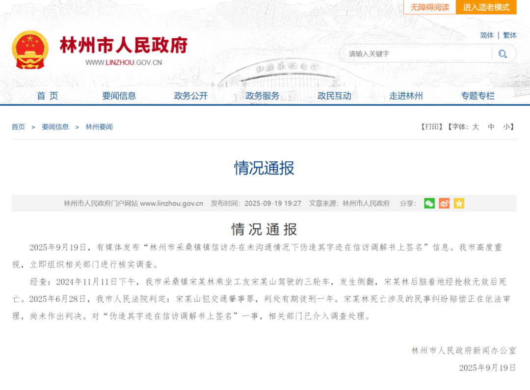 2025年9月19日,有媒体发布“林州市采桑镇镇信访办在未沟通情况下伪造其字迹在信访调解书上签名”信息。我市高度重视,立即组织相关部门进行核实调查。
