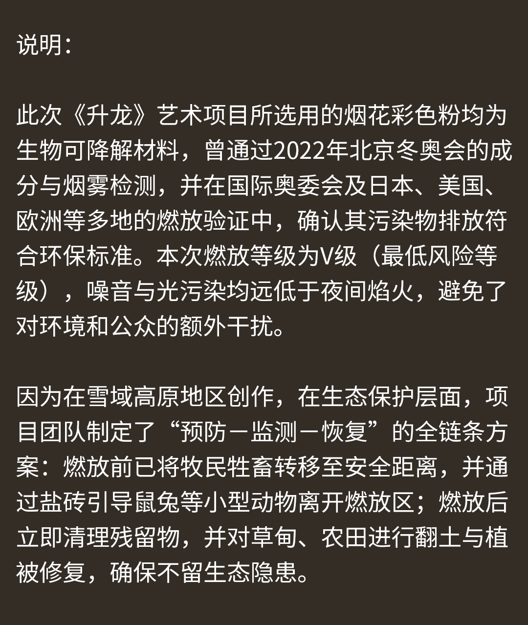 封面新闻记者查询此前报道,主办方表示,此次活动均在科学评估和严格指导下进行,秉持对自然最大的敬畏。同时,艺术创作使用的是环保材料,所选用的彩色粉为生物可降解材料,曾通过2022年北京冬奥会的成分与烟雾检测,并在国际奥委会及日本、美国、欧洲等多地的燃放验证中,确认其污染物排放符合环保标准。燃放后,相关工作人员立即对山体和溪流边清理残留物,并对山体植被进行翻土与植被修复,不留生态隐患。