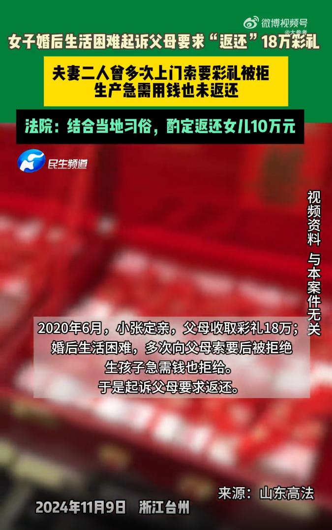浙江台州的小张2020年6月与男方相亲后订婚,小张的父母向男方收取了18万彩礼,婚后因丈夫家庭条件不宽裕,生活困难为补贴生活开支,多次向父母索要其婚前收取的18万元彩礼均遭到拒绝甚至小张生产住院急需医疗费时,父母也不愿返还,2024年小张提起诉讼要求父母返回18万彩礼。