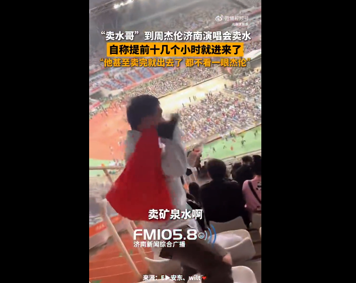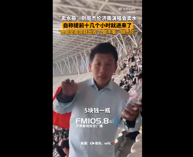 9月19日,山东济南,卖水哥居然到了周杰伦济南演唱会卖水,他自称提前十几个小时就进场馆内了,大爷说:“早上进来的,在这待了十几个小时饭都没吃。”