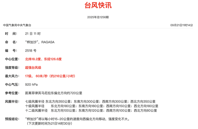 9月21日11时,中央气象台台风快讯显示,“桦加沙”已加强至中心附近最大风力17级的超强台风