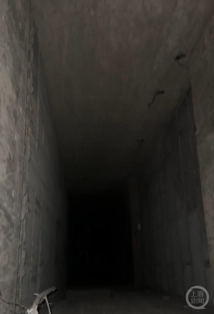 上游新闻记者顺着楼梯进入地下一层,通过手电向上下望去,仍看不见底。目测,井口约有1米宽,1.5米长。井道直至抵达地下室底部。在地下4层,上游新闻记者才能看到井底。井底内没有积水,仅残留少量建筑垃圾。上游新闻记者在现场粗略估算,这口井深有十余米。
