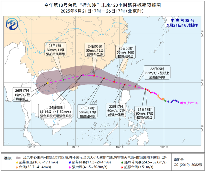 据中国天气网介绍,预计9月21日至26日,巴士海峡、南海北部、北部湾、琼州海峡等海域及华南沿海将先后有9~11级大风,台风“桦加沙”中心经过的附近海域或地区有12~17级大风,阵风17级以上。