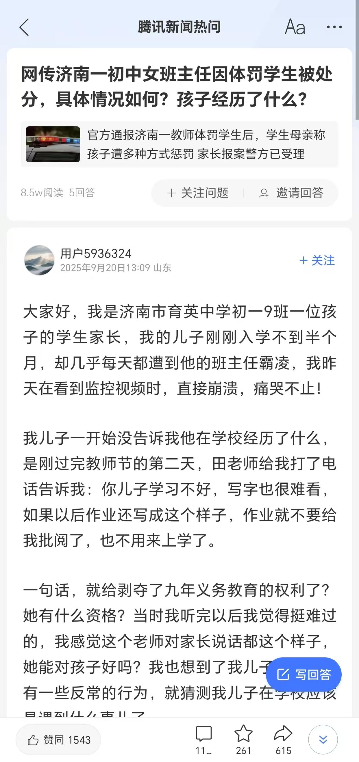 付女士在短视频平台、腾讯新闻热问等多种渠道,讲述了自己在济南市育英中学读书的孩子被班主任“霸凌”的遭遇。付女士称,自己的儿子刚刚入学不到半个月,却几乎每天都遭到他的班主任霸凌,她自己到学校查看了监控视频,心态直接崩溃了。儿子一开始没说,自己在学校经历了什么。9月11日,付女士接到班主任电话,称她儿子学习不好,写字也很难看,如果以后作业还写成这个样子,作业就不要给我批阅了。