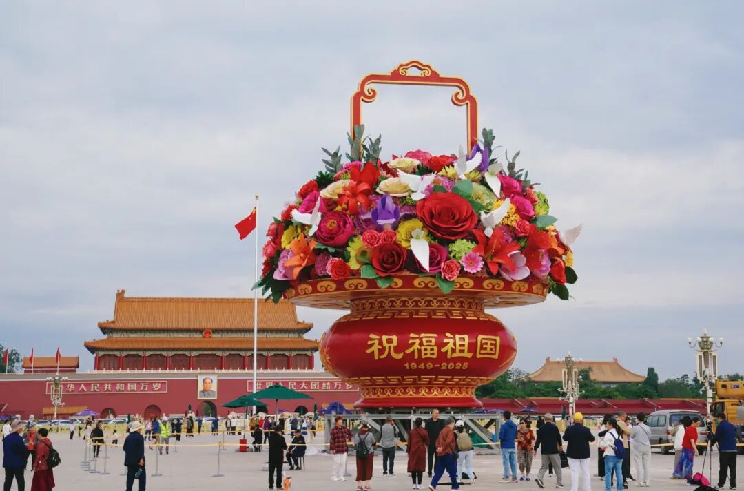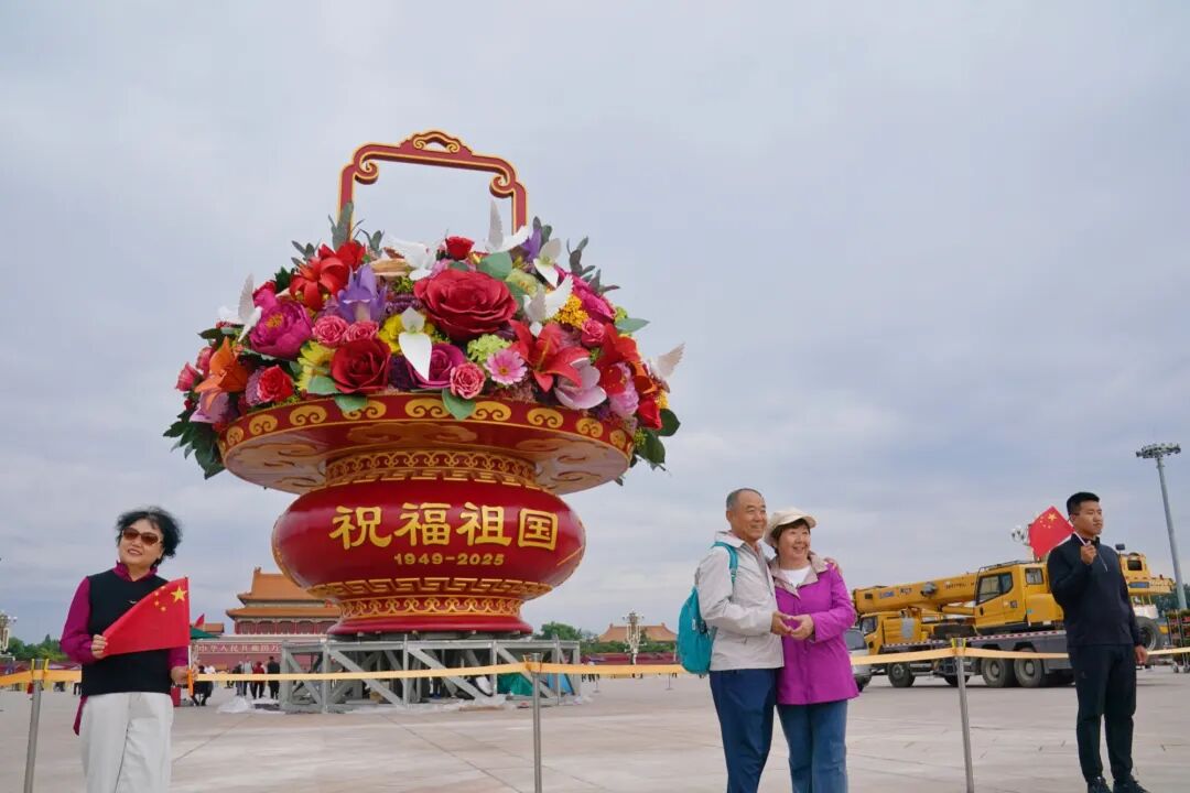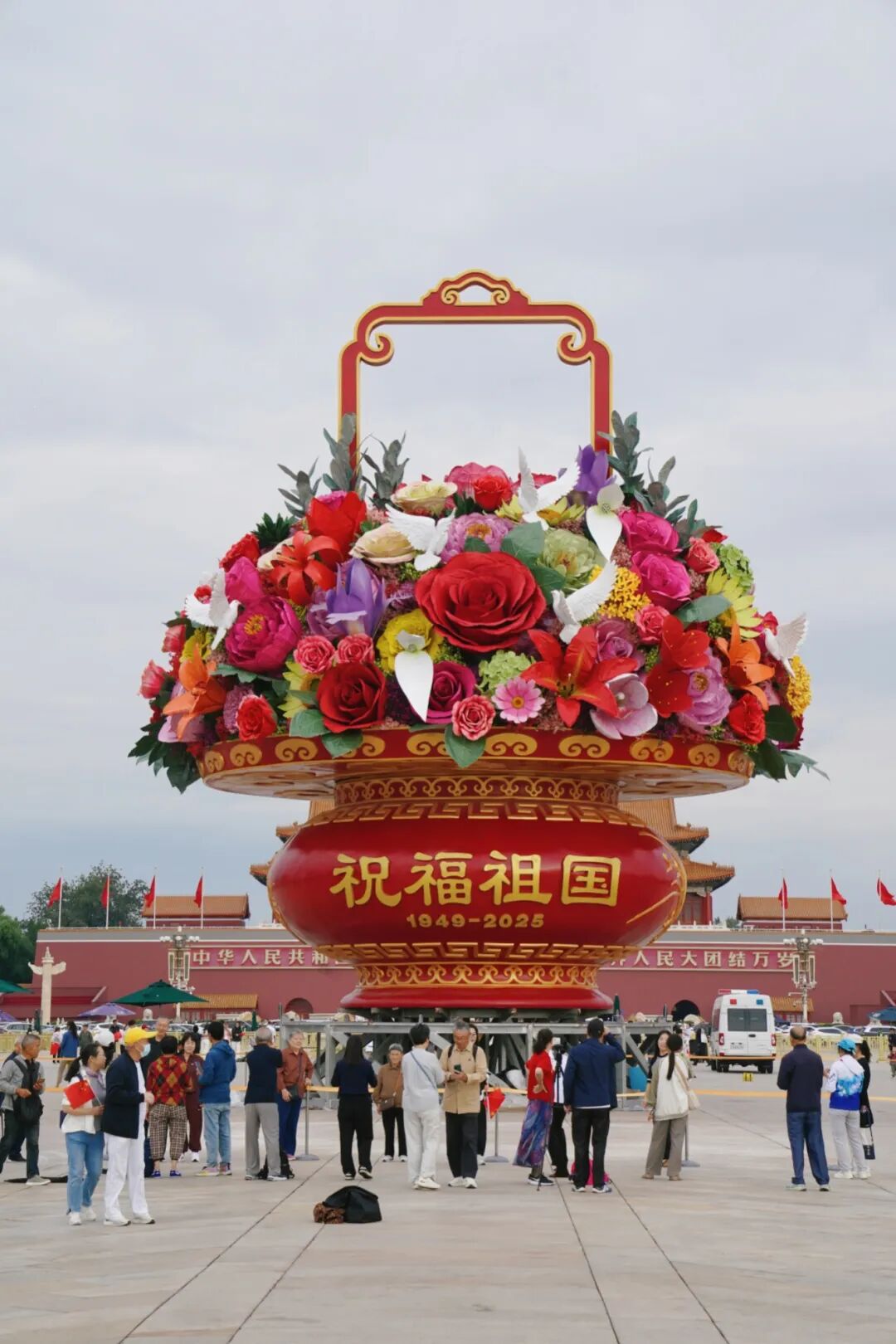 据悉,本次天安门广场中心“祝福祖国”花坛以喜庆的花篮为主景,花坛底部直径45米,为向日葵图案,寓意葵花朵朵向太阳。花坛顶高18米,篮体高16米,篮盘直径12米。在篮体南侧书写“祝福祖国,1949-2025”字样,在篮体北侧书写“欢度国庆,1949-2025”字样。