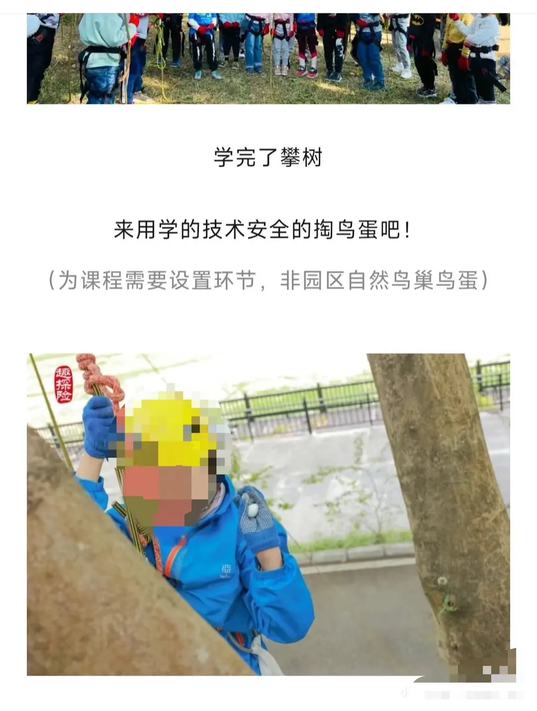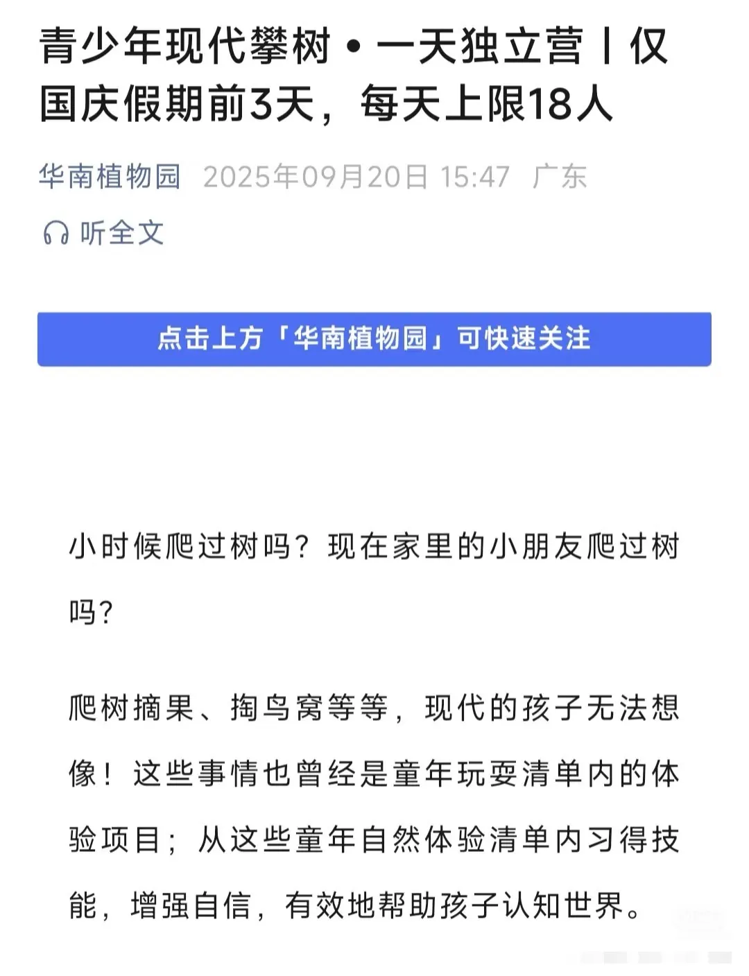 9月22日上午,大皖新闻记者注意到,华南植物园微信账号上已经无法找到该推文内容,但在网民发布的帖文中,活动原贴提到攀树活动“仅国庆假期前三天,每天上限18人”。活动原文中介绍,爬树摘果、掏鸟窝等活动属于曾经的童年玩耍清单项目,“从这些童年自然体验清单内习得技能,有效帮助孩子认知世界。”活动原推文中也标注提醒称“为课程需要设置环节,非园区自然鸟巢鸟蛋”。