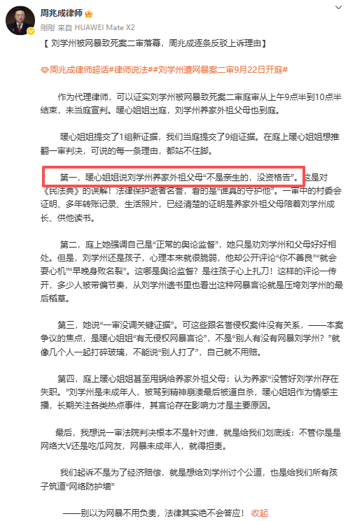 代理律师周兆成发文表示,此次二审的核心争议点有两个:一是刘学州养外祖父母是否具备维护刘学州逝者名誉权的诉讼主体资格;二是被上诉人暖心姐姐在网络平台上发表的言论,是否构成对刘学州名誉权的侵害。