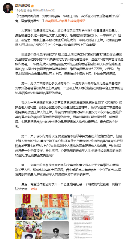 近日,刘学州养外祖父母的代理律师周兆成在社交媒体发布,刘学州被网暴致死案将于9月22日进行二审开庭审理,知名学者储殷将作为专家证人出具专家意见。
