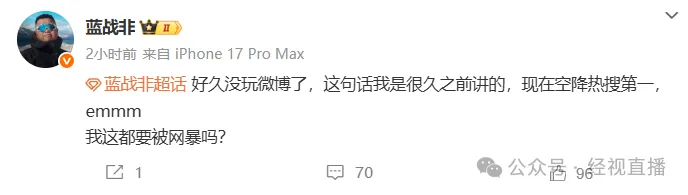 22日中午,“蓝战非”发文称:“好久没玩微博了,这句话我是很久之前讲的,现在空降热搜第一,我这都要被网暴吗?”