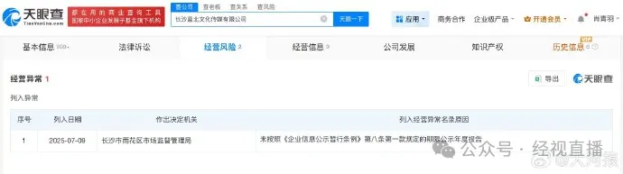 经营风险信息显示,今年7月,长沙蓝北文化传媒有限公司因未依照规定的期限公示年度报告,被长沙市雨花区市场监督管理局列入经营异常名录。