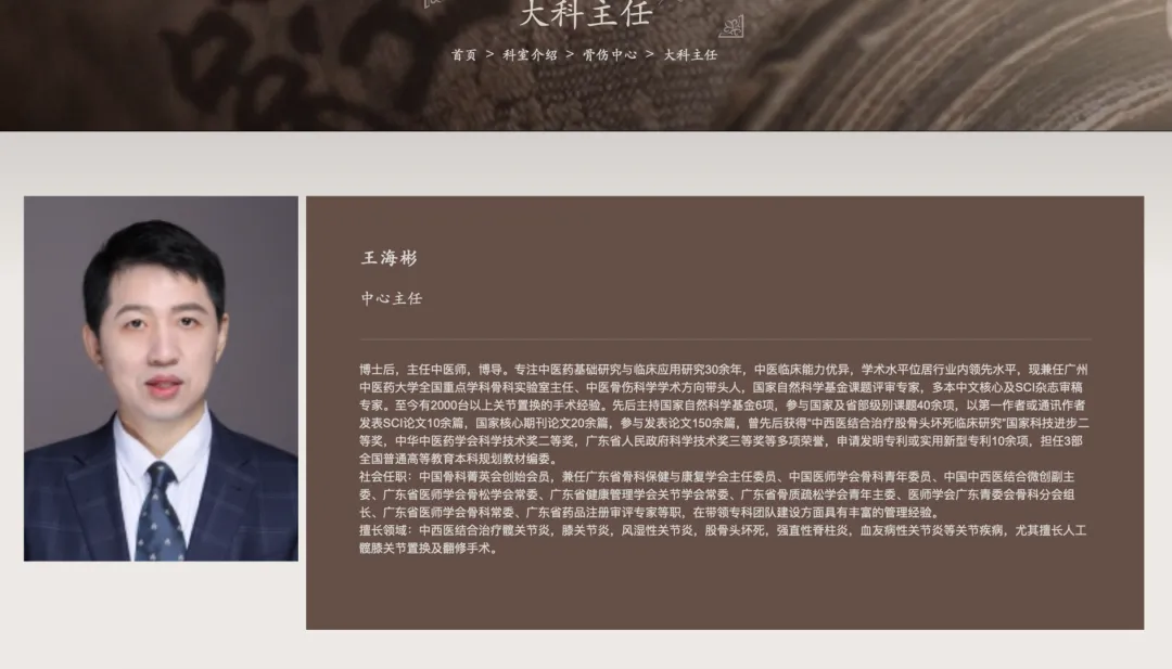 广州中医药大学第一附属医院官网显示,王海彬,男,1971年4月出生于山东,博士,博士后,博导,为该院骨科主任中医师。专注中医药基础研究与临床应用研究30余年,现兼任广州中医药大学全国重点学科骨科实验室主任、中医骨伤科学学术方向带头人,国家自然科学基金课题评审专家,多本中文核心及SCI杂志审稿专家。至今有2000台以上关节置换的手术经验。擅长领域包括;中西医结合治疗髋关节炎,膝关节炎,风湿性关节炎,股骨头坏死,强直性脊柱炎,血友病性关节炎等关节疾病,尤其擅长人工髋膝关节置换及翻修手术。