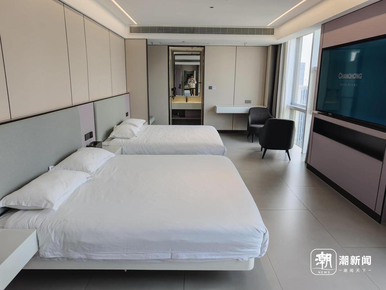 桃子酒店8802房间,毛估估40平方米,配上全落地窗,有点大气。两张床,正对的就是钱塘江,可以望见不远处的杭州奥体中心体育馆,“客人们都说,最喜欢在这里看夕阳,很美。”