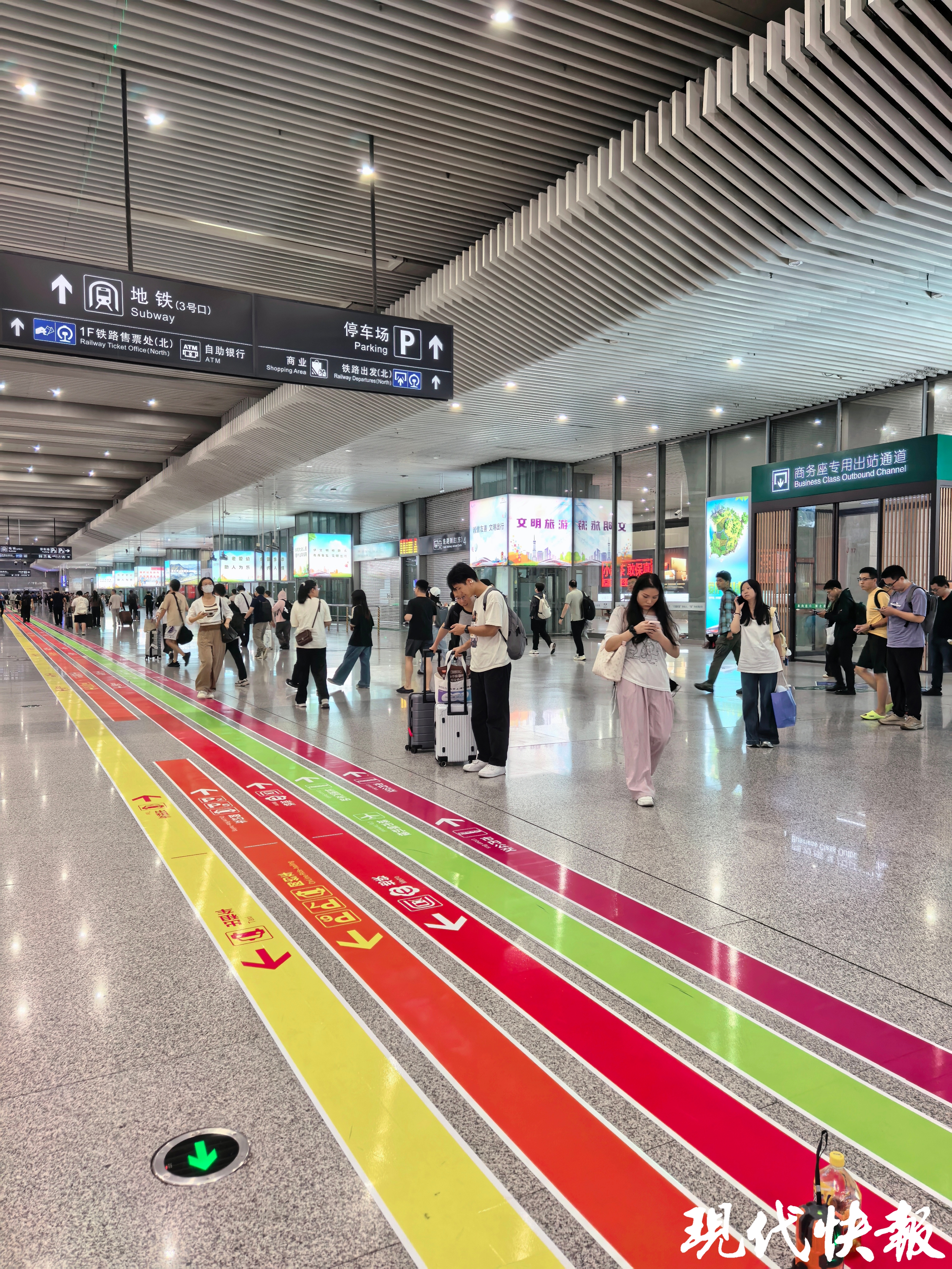 该项目自7月启动以来,2个月内先后完成设计和施工。施工过程中,项目团队采用分区域、分时段施工模式,最大限度降低对旅客通行的影响。南京站的彩虹地贴铺设总长约2km;南京南站的彩虹地贴铺设总长约9.5km,同步在相应的通道立柱上优化引导标识26处,新增站内定位编号47处。