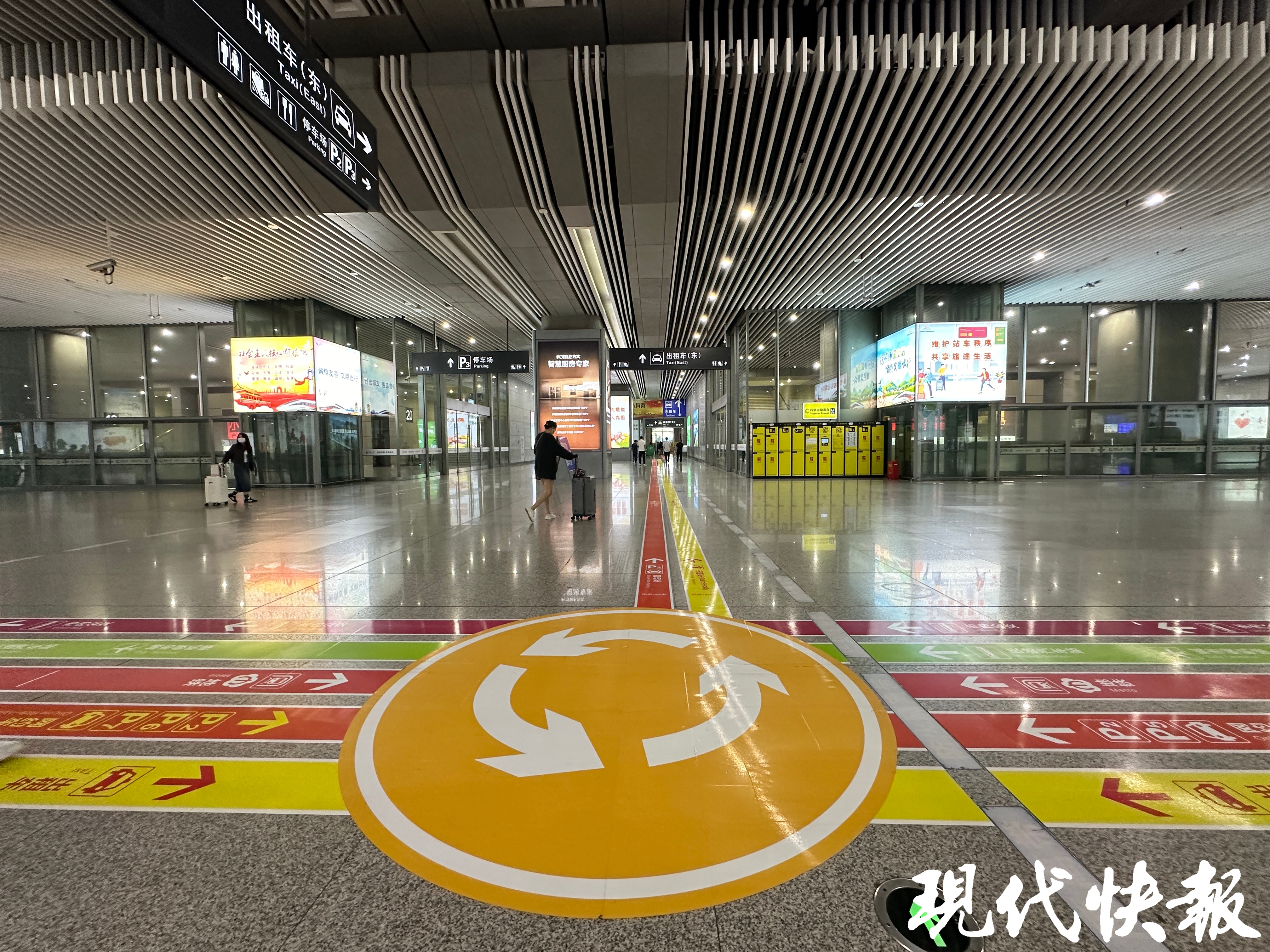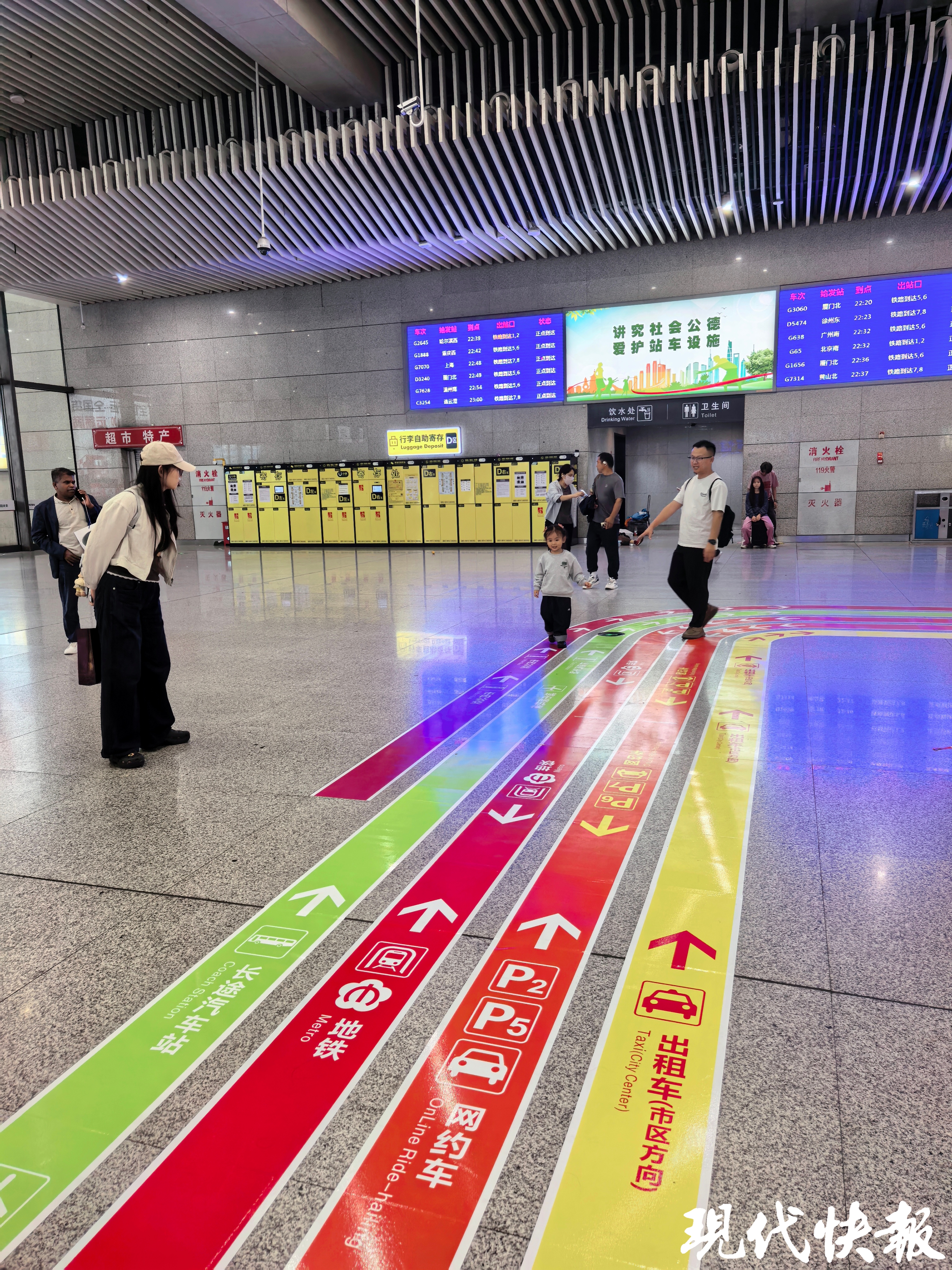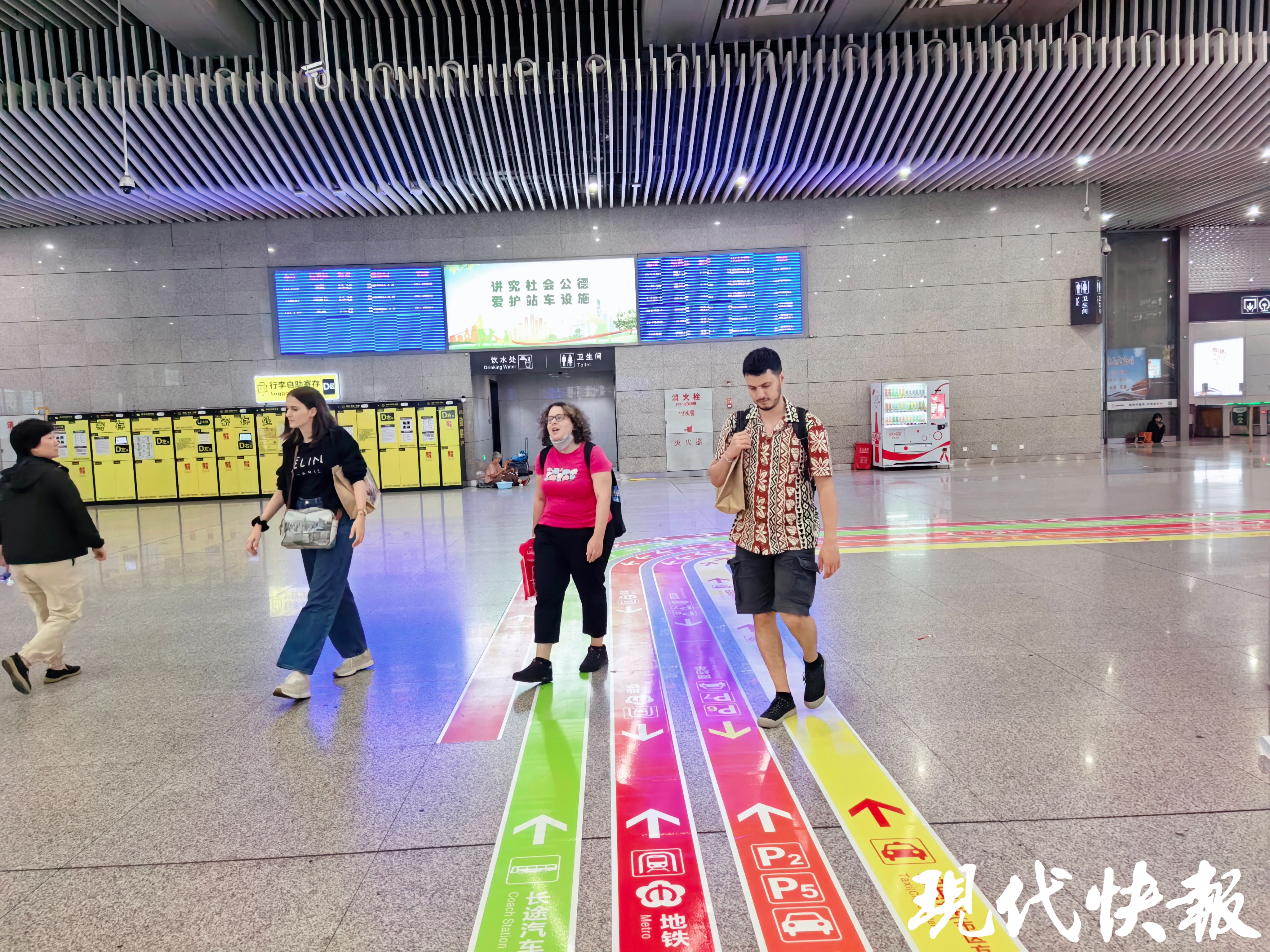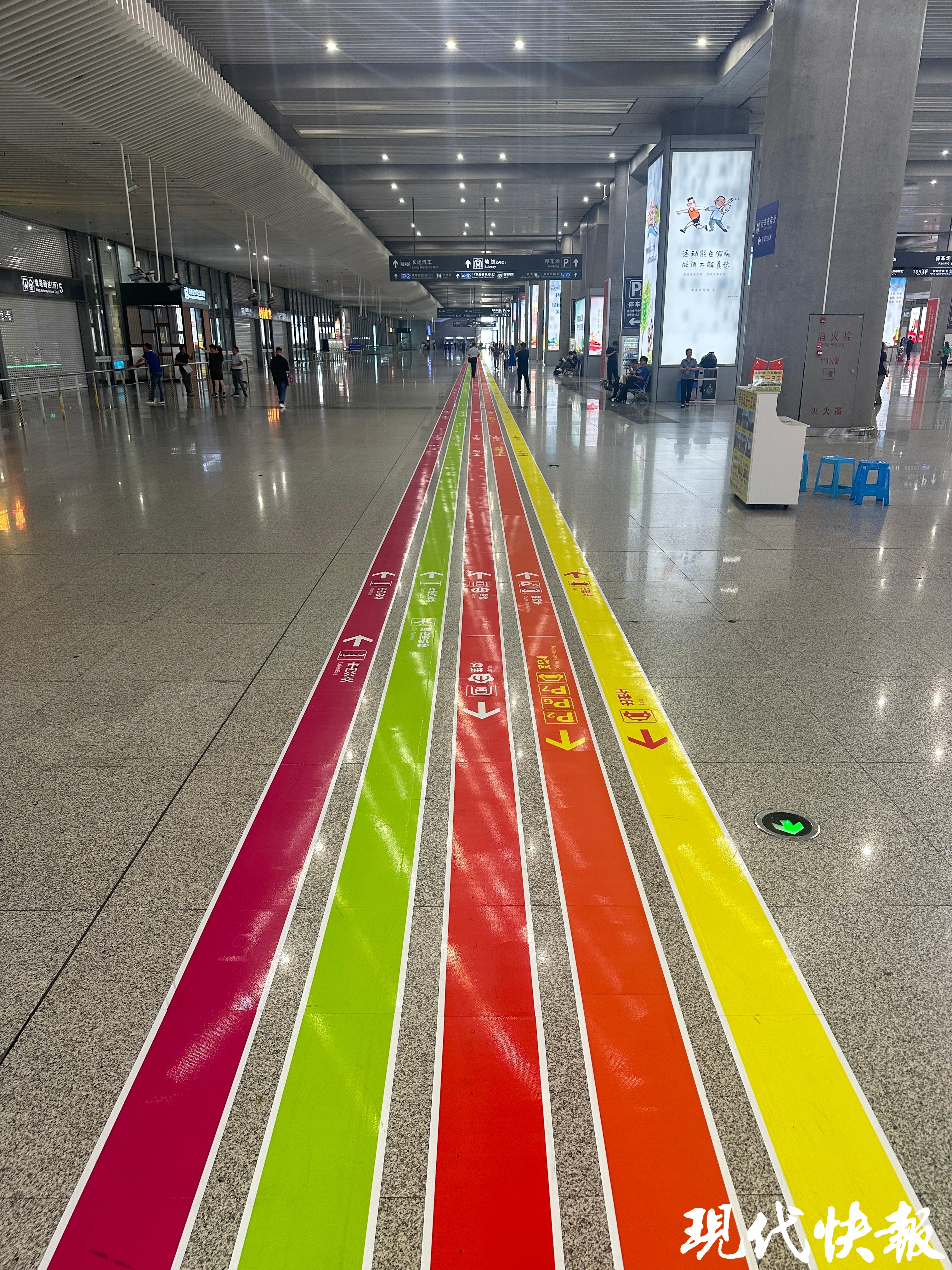 现代快报讯(记者李娜 通讯员宁交宣)9月22日,现代快报记者了解到,由南京市交通运输局主导实施的南京站、南京南站出站导视系统已基本完成升级改造。全新的地面导向标志,突出色彩记忆强化与点位标识优化,打造出“彩虹地贴”。今后,从南京两大高铁站出站,不用担心迷路了。