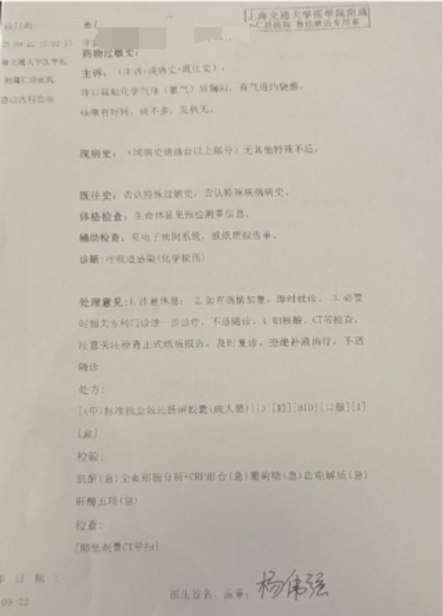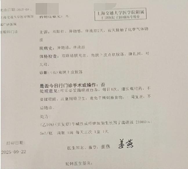 医院诊断记录显示,诊断为(双)角膜上皮脱落;呼吸道感染(化学损伤),医生提醒不要揉眼睛,注意用眼卫生。一周复查,不是随诊。