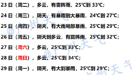 9月23日,粤东、珠三角南部、梅州南部和河源南部市县有暴雨到大暴雨局部特大暴雨;其余市县多云到阴天,有(雷)阵雨局部暴雨。雷雨时伴随8~10级短时大风。最高气温:粤东和珠江口东侧市县28~31℃,其余市县33~36℃,个别市县37℃左右。