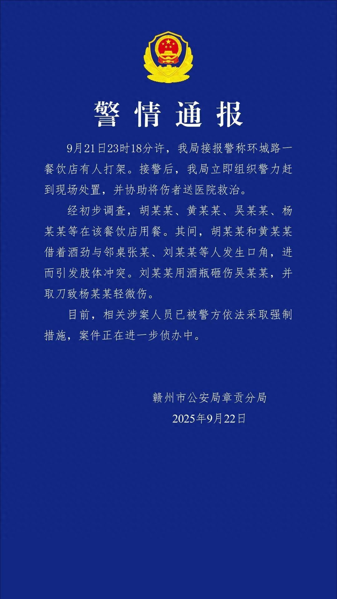 江西赣州章贡警方通报“一餐饮店有人打架”:涉案人员已被采取强制措施