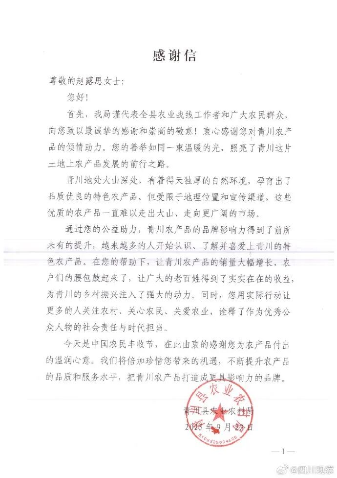 当天,四川省广元市青川县农业农村局发感谢信,对赵露思表示感谢:通过您的公益助力,青川农产品的品牌影响力得到了前所未有的提升,越来越多的人开始认识、了解并喜爱上青川的特色农产品。在您的帮助下,让青川农产品的销量大幅增长,农户们的腰包鼓起来了,让广大的老百姓得到了实实在在的收益,为青川的乡村振兴注入了强大的动力。