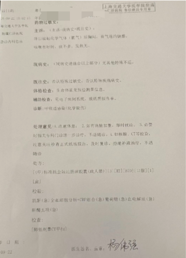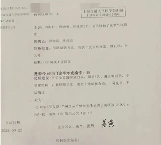 医院诊断记录显示,诊断为(双)角膜上皮脱落;呼吸道感染(化学损伤),医生提醒不要揉眼睛,注意用眼卫生。一周复查,不适随诊。