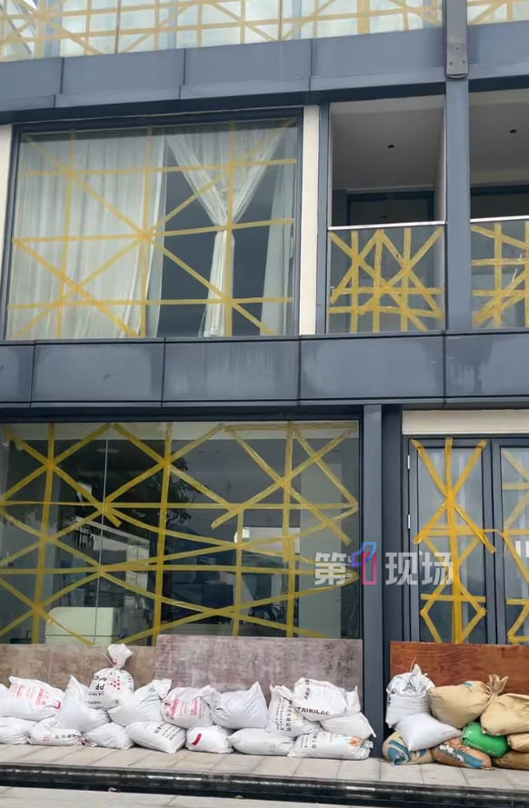 大鹏新区较场尾,民宿的老板正组织工人进行紧急防汛措施,堆沙袋,封门窗,劝退客人,确保安全。