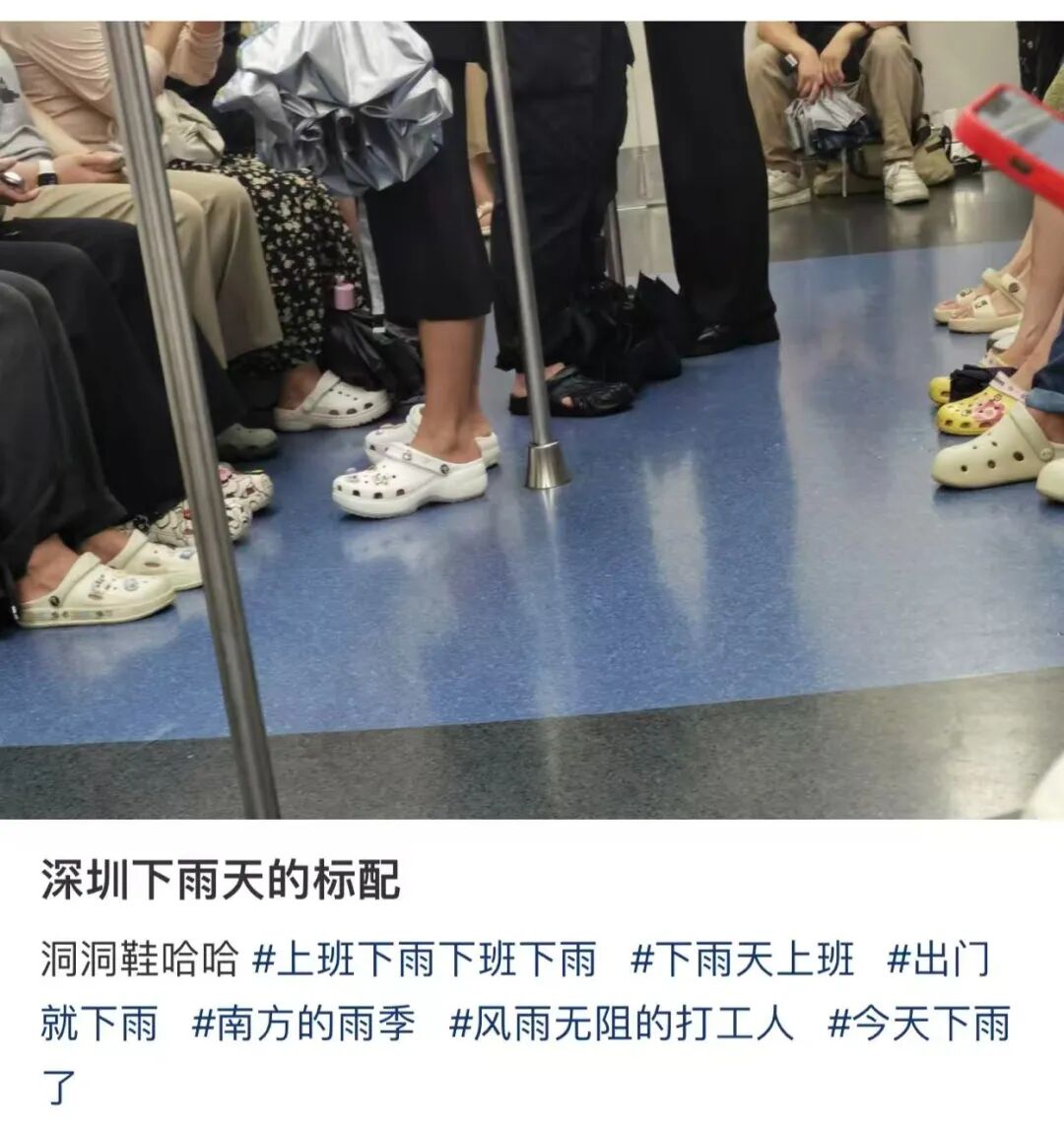 今天上午10时20分,第一现场记者看到南山区科兴科学园的打工人正常上班,但与平时不同的是,今天很多人都换成了暴雨天气装备:拖鞋、凉鞋、洞洞鞋、速干短裤等。