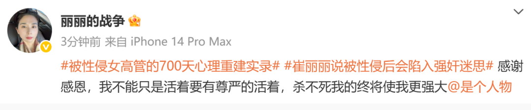 姚晨为崔丽丽发声:去年就看到了有关报道。丽丽是极少数选择在采访中实名讲述的受害者。她更是一位勇敢无畏的女士。难以想象这一路她历经过多少人性之恶,但依然用坚定的信念与智慧为自己而战!也为生活中太多遭遇类似侵害却无法发声的女性,发出了巨大的、响亮的呐喊。