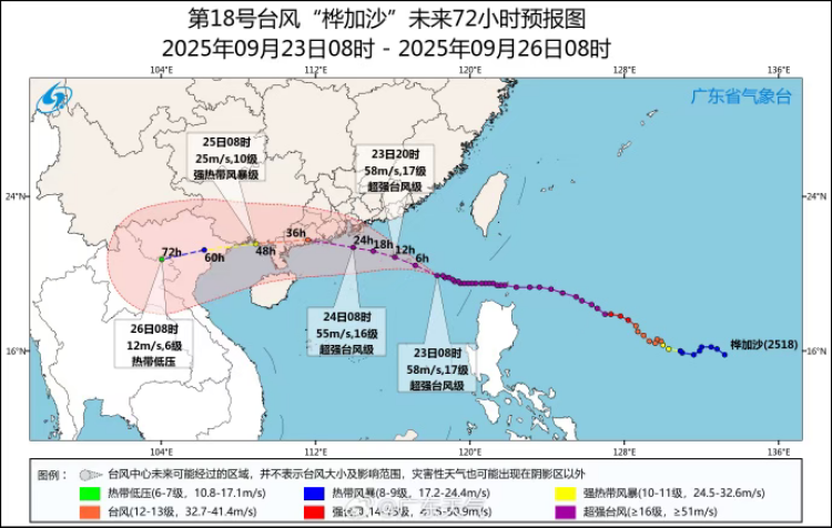据海南省气象台9月23日上午消息,今年第18号台风“桦加沙”(超强台风级)已进入南海东北部海面,将于24日在广东深圳到徐闻一带沿海登陆(强台风级或超强台风级,14-16级,45-52米/秒)。23日10时,广东省防汛防旱防风总指挥部将防风Ⅱ级应急响应提升为防风Ⅰ级应急响应,要求重点地区果断采取“五停”措施(即停课、停工、停产、停运、停业)。