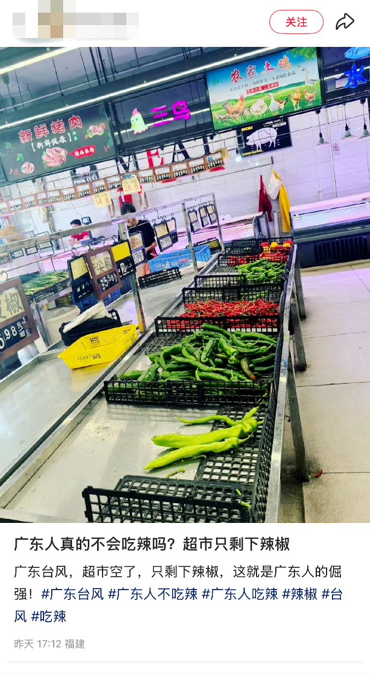 记者注意到,有市民晒出“扫货囤粮”的照片,不仅有果蔬蛋奶肉,还有蜡烛,其表示:“当广东人开始准备蜡烛的时候,证明这‘桦加沙’台风是真的很ging……”另据广东广播电视台报道,9月22日记者实地走访,发现深圳有商超部分货架已清空,只有辣椒被剩下,话题#广东部分商超被搬空只剩辣椒#登上了热搜。
