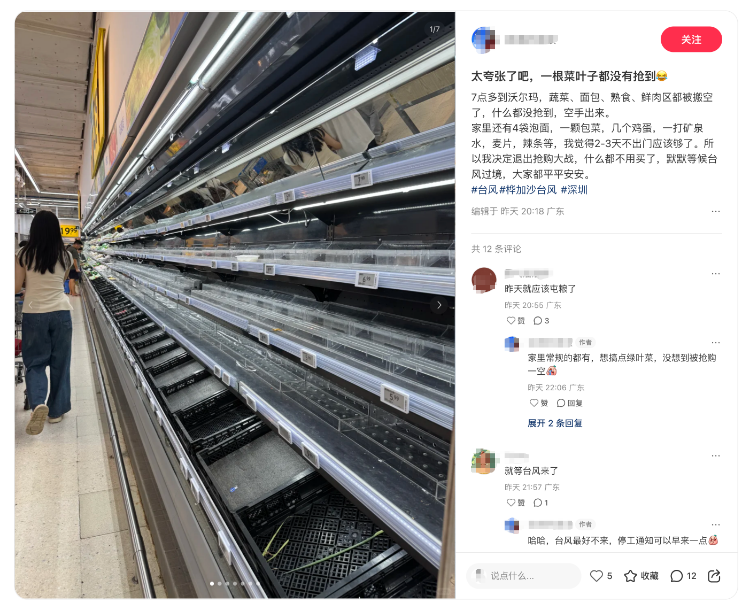 超强台风“桦加沙”即将强势登陆,为了应对台风可能带来的影响,市民们纷纷前往超市抢购物资。22日有深圳市民发帖称:“7点多到沃尔玛,蔬菜、面包、熟食、鲜肉区都被搬空了,什么都没抢到,空手出来。家里还有4袋泡面、一颗包菜、几个鸡蛋、一打矿泉水、麦片、辣条等,我觉得2-3天不出门应该够了。我决定退出抢购大战,什么都不用买了,默默等候台风过境,大家都平平安安。”
