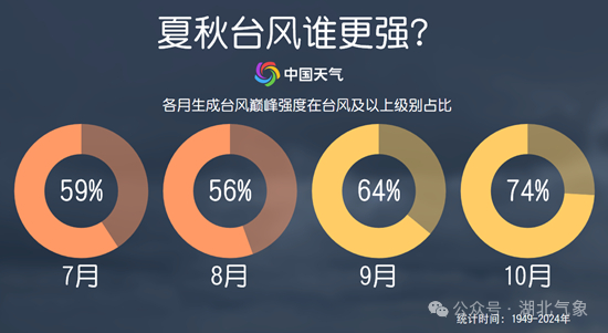 通常,我们把6月至8月生成的台风称为夏台风,9月至11月生成的台风称为秋台风。 主要是由于秋台风绝大多数生成在西北太平洋洋面,那里距离陆地远,给予了它足够的发展空间和时间。加之此前洋面经过整个夏季阳光的加热作用,已经积累了很多热量。初秋时节,阳光直射区向南移动过程中再次加热热带海洋,使得海洋热量达到顶峰,所以强台风更容易出现在这个时间。 与夏台风相比,秋台风生命史普遍较长,有利于台风强度的发展。此外,秋季,台风受南海季风的影响越来越小,尽管秋台风体积普遍不太大,但是台风结构的对称性更好,容易发展得更强。 秋台风的“狠”不仅体现台风强度上,还体现在灾害影响上。由于秋季冷空气逐渐增多,台风更容易遇到冷空气,“秋台风+冷空气”是个可怕的组合,两者联手往往会激发出猛烈的降水,从而导致更大的灾害。 统计显示,1949年至2024年间,夏季生成台风个数为867个,为台风最活跃季节,而秋季也有859个台风生成,全年占比44%,仅次于夏季。 虽然夏季台风的生成数量是一年中最多的,但从各台风的巅峰强度来看,秋台风的实力更胜一筹。 1949年至2024年数据显示,七月和八月的台风,巅峰强度在台风及以上级别占比不足60%(在当月台风总数中的占比),而九月和十月台风的巅峰强度达到台风及以上级别的占比都超过60%,其中十月高达74%。 值得一提的是,秋季生成的超级台风个数以绝对优势碾压夏台风。 历史上,曾有多个秋台风给我国造成过严重影响。1949年至2024年共有9个秋台风以超强台风级别登陆我国,虽然概率不高,可一旦遇上,破坏力极强。 登陆我国的最强秋台风还要数2024年的台风“摩羯”,它以超强台风级别接连登陆我国海南文昌、广东徐闻和越南广宁,这在整个台风界都是非常罕见的。 排名第二的是超强台风“Marge”,1973年9月14日,它登陆了海南琼海,共造成海南省超900人死亡,超6万人受伤,12.6万间房屋倒塌,损失惨重。 还有一个令人印象深刻的秋台风,是2016年的“莫兰蒂”,在9月15日中秋节当天,它以超强台风级别登陆福建厦门后,一路向西北方向挺进,给福建、广东、江西、浙江、上海、江苏等11个省份带去狂风暴雨,在台风历史上留下了浓墨重彩的一笔。