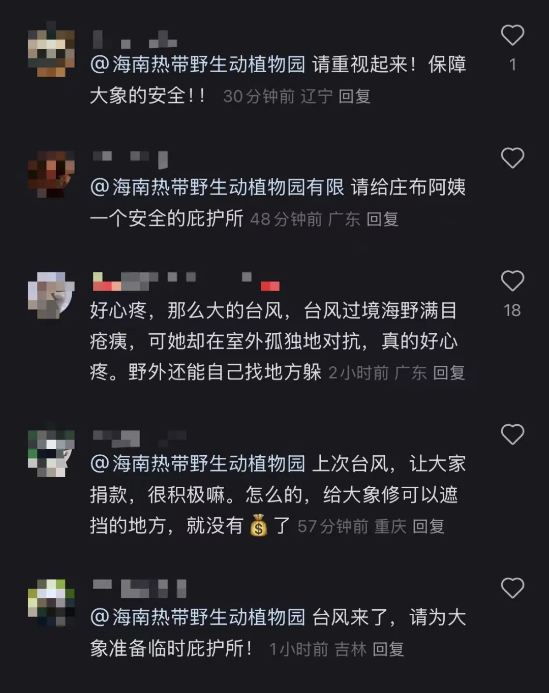 值得注意的是,2024年9月,超强台风“摩羯”登陆海南文昌,海南热带野生动物园遭到严重破坏,据统计,该园区内野生动物无伤亡、无外逃,植物折断倒伏近90%。大象庄布曾在狂风暴雨中独自对抗台风“摩羯”。