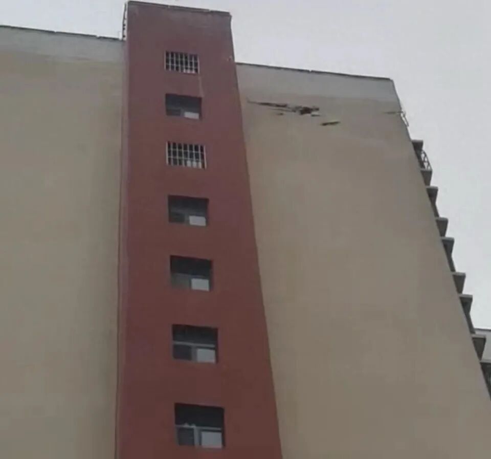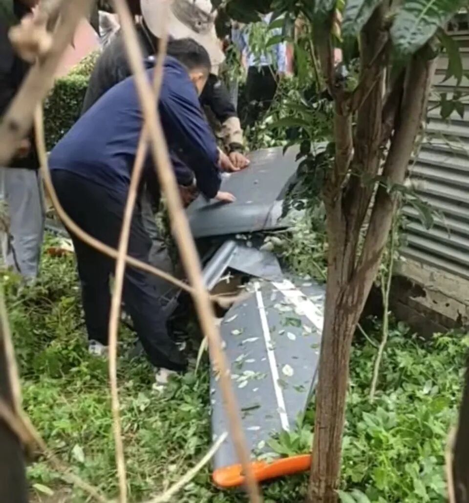 现场视频显示,无人机在飞行时撞上了一栋17层高的住宅楼,碰撞部位在顶层处,造成墙面凹陷、墙砖掉落。残骸可见,无人机为灰色涂装,单侧机翼长度超过1米。