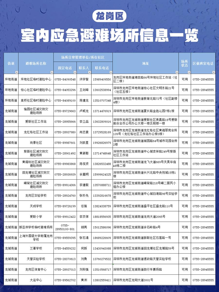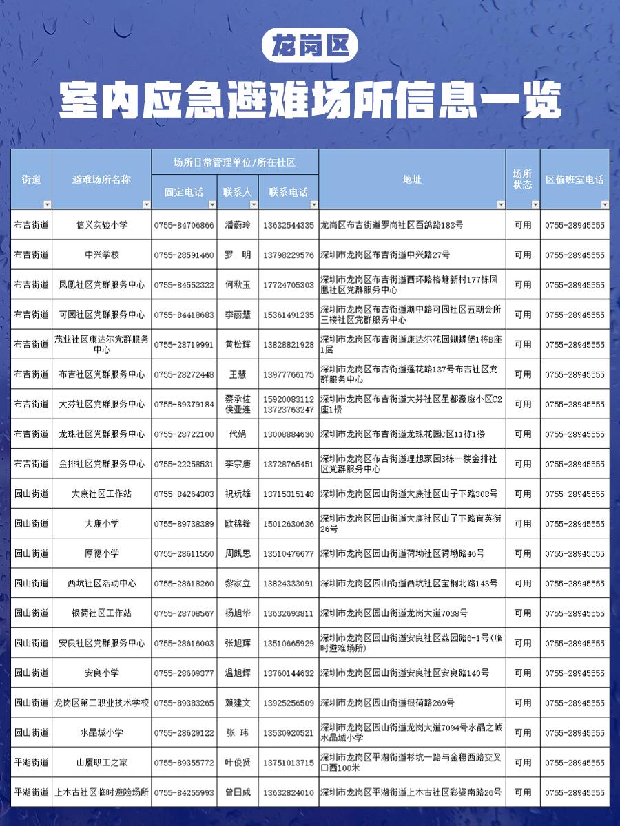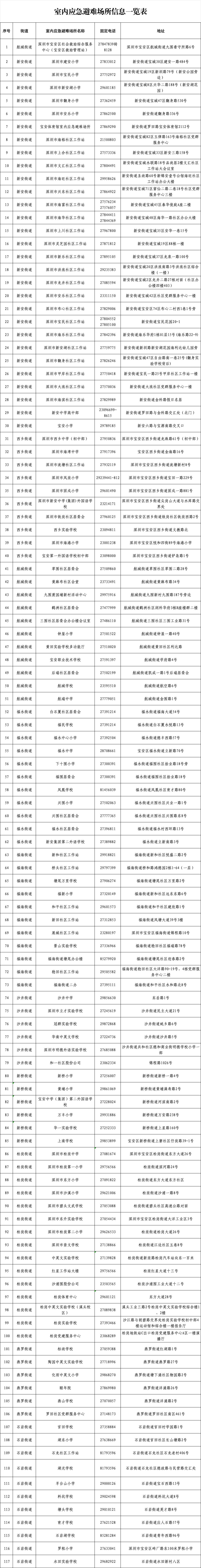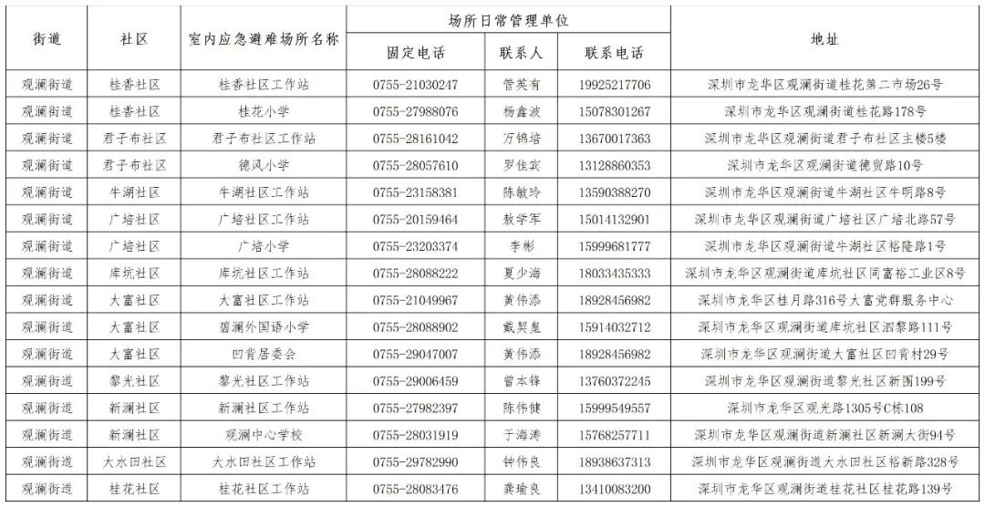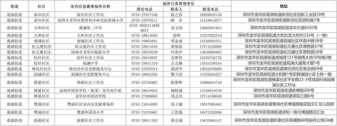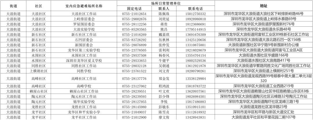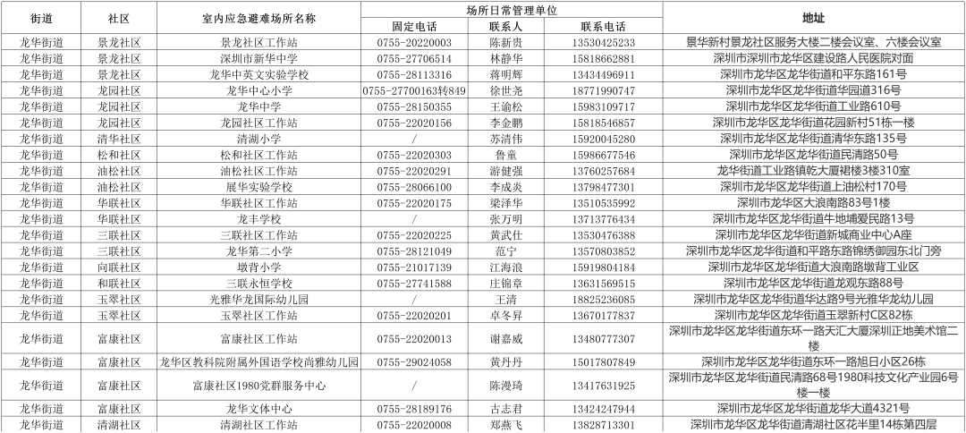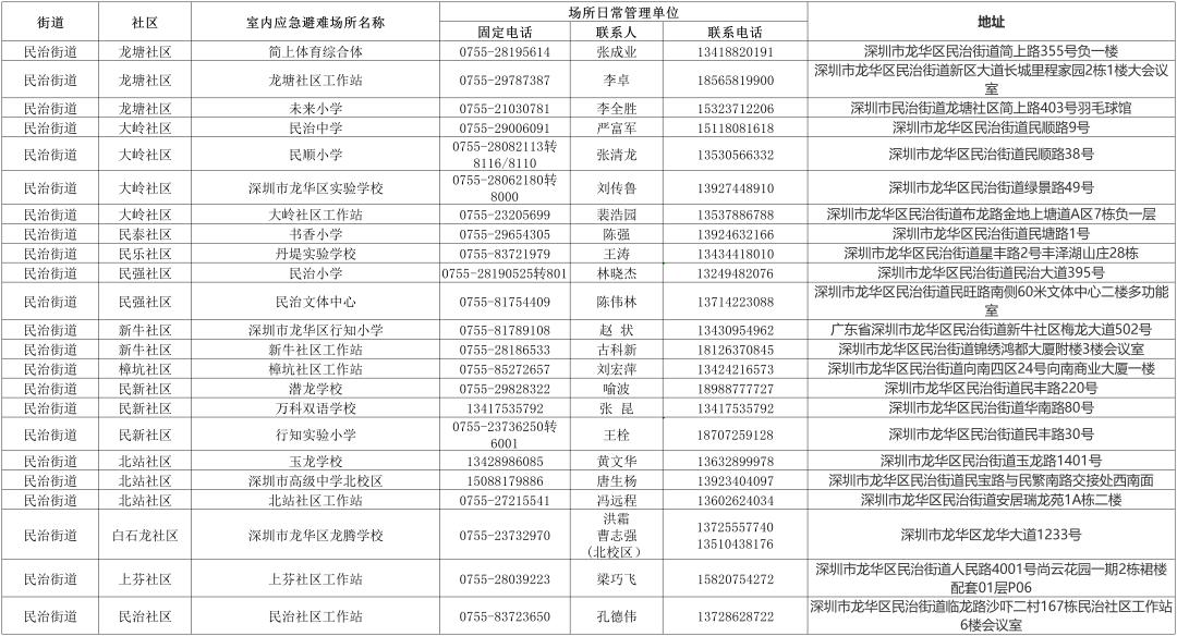 【深圳市室内应急避难场所信息一览表】