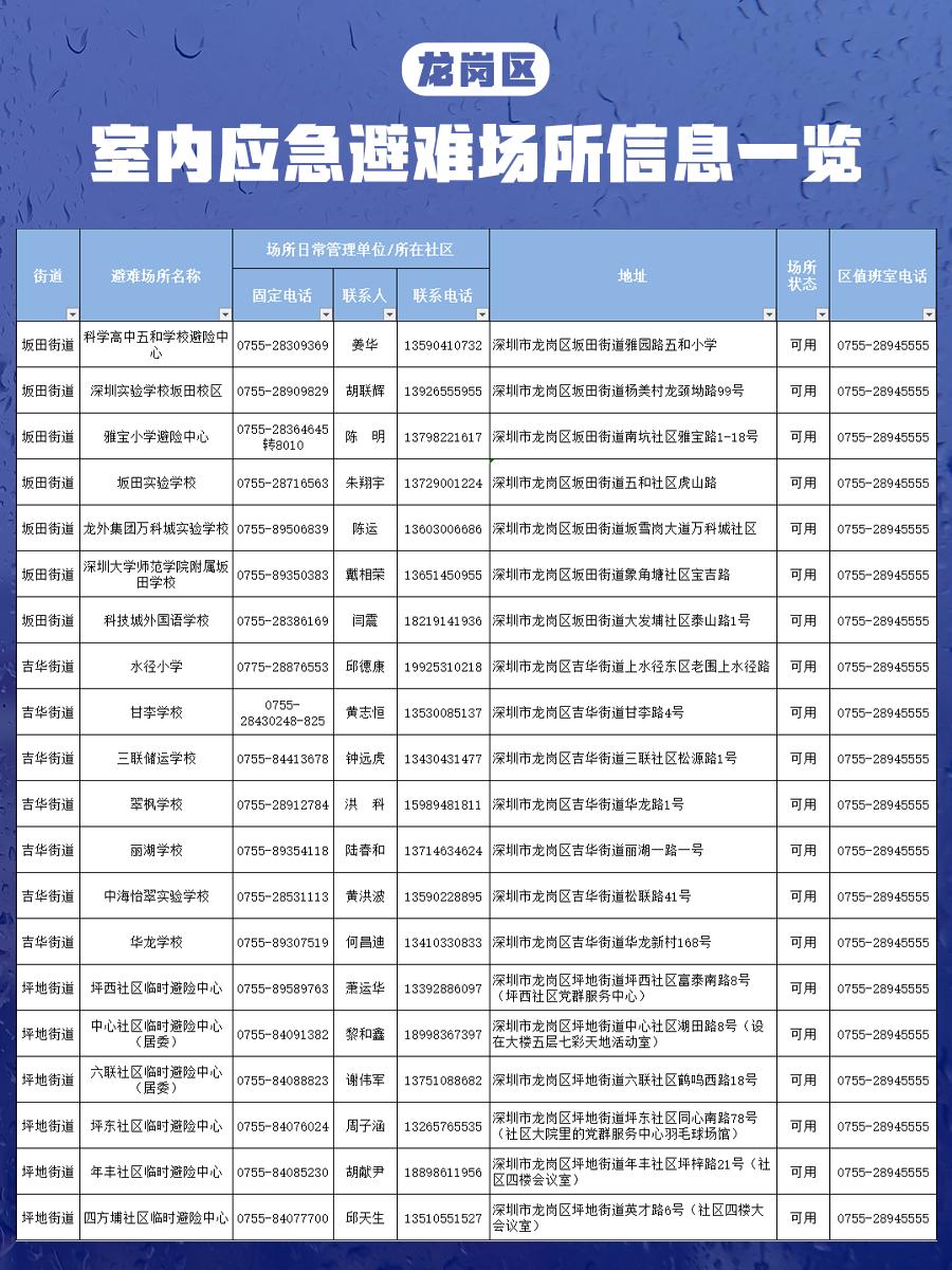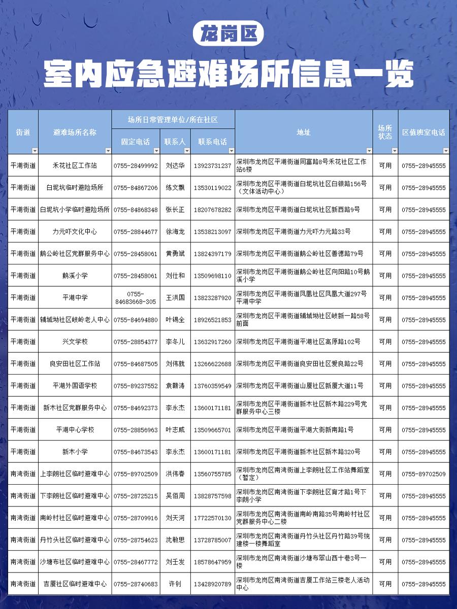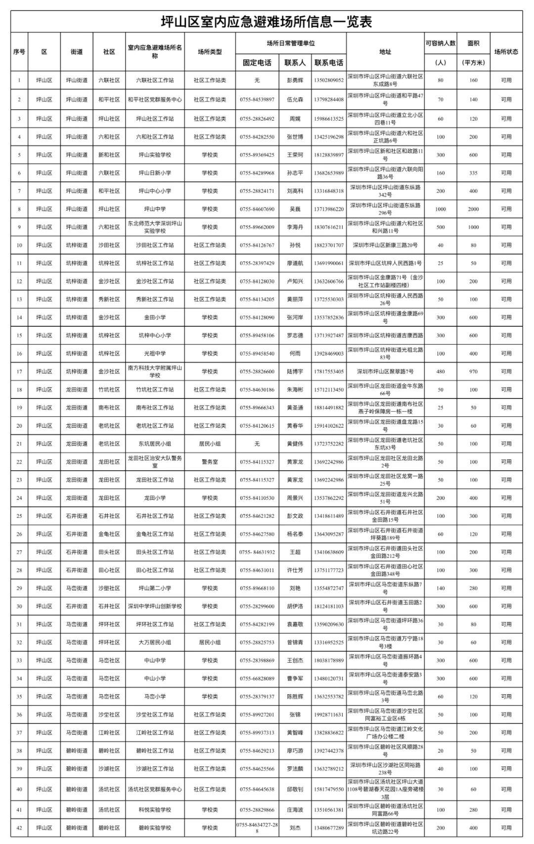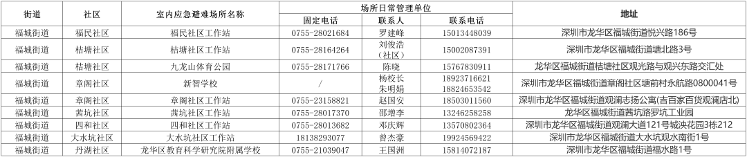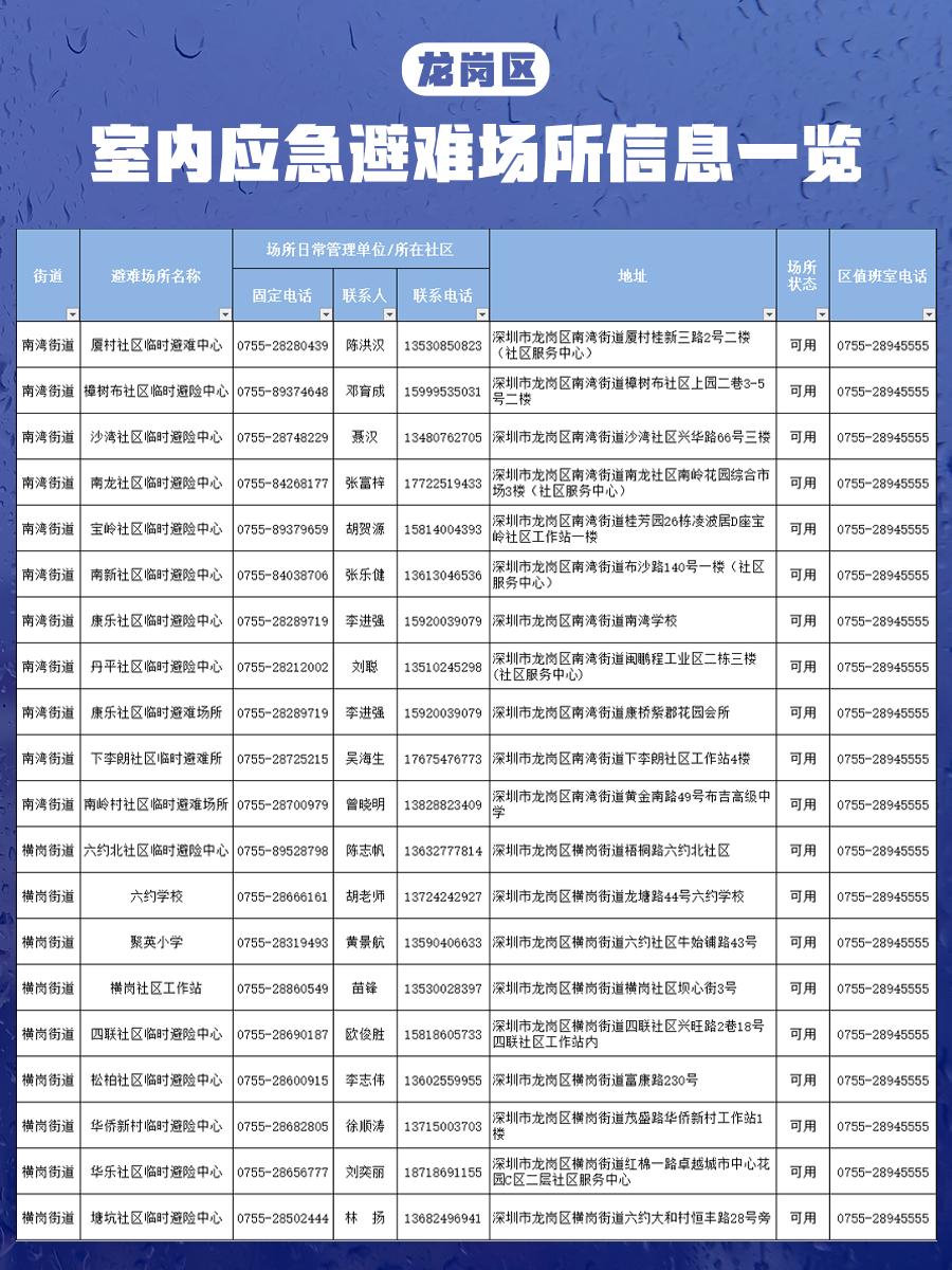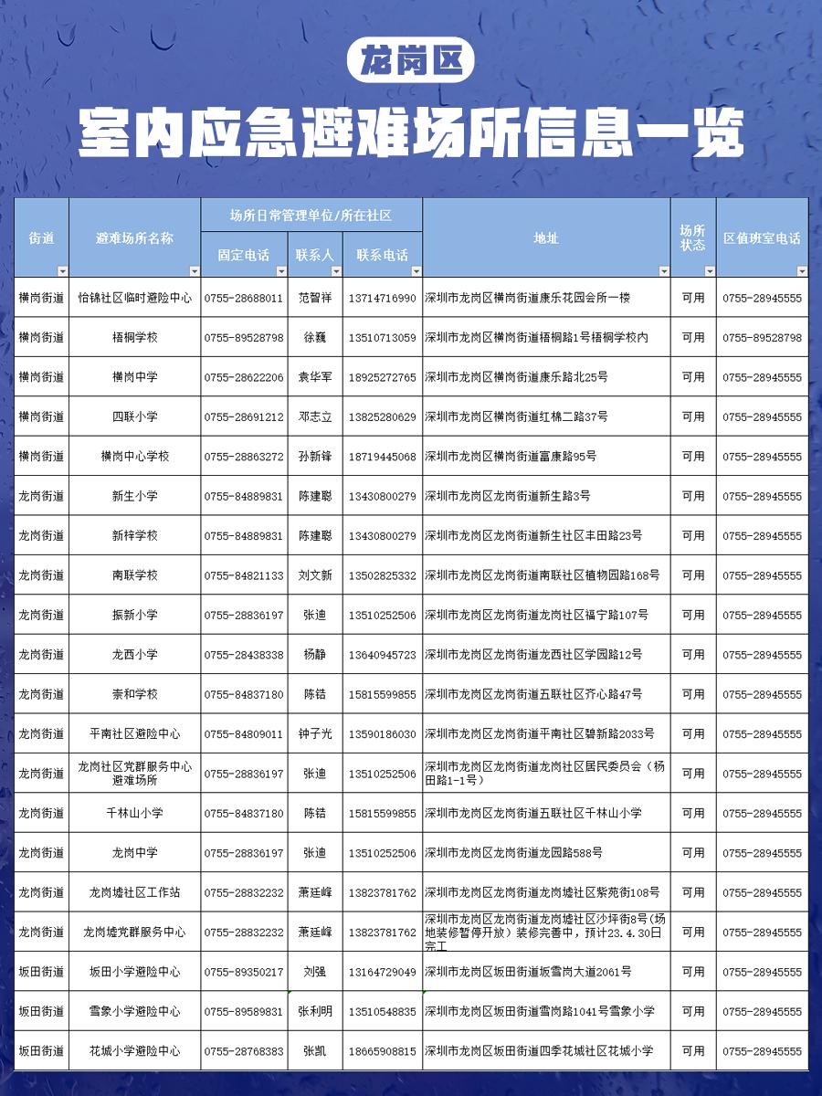 【深圳市室内应急避难场所信息一览表】
