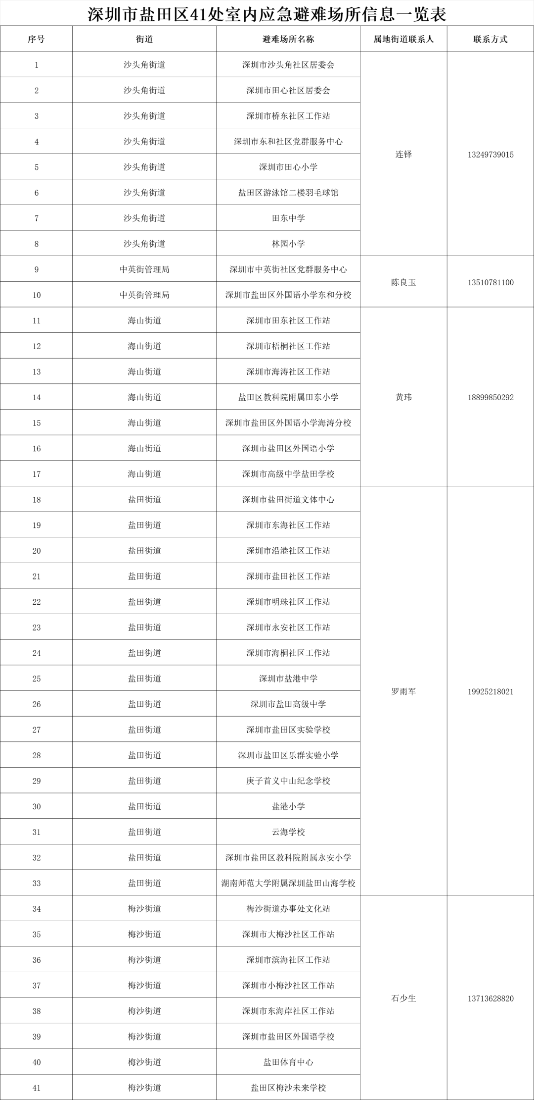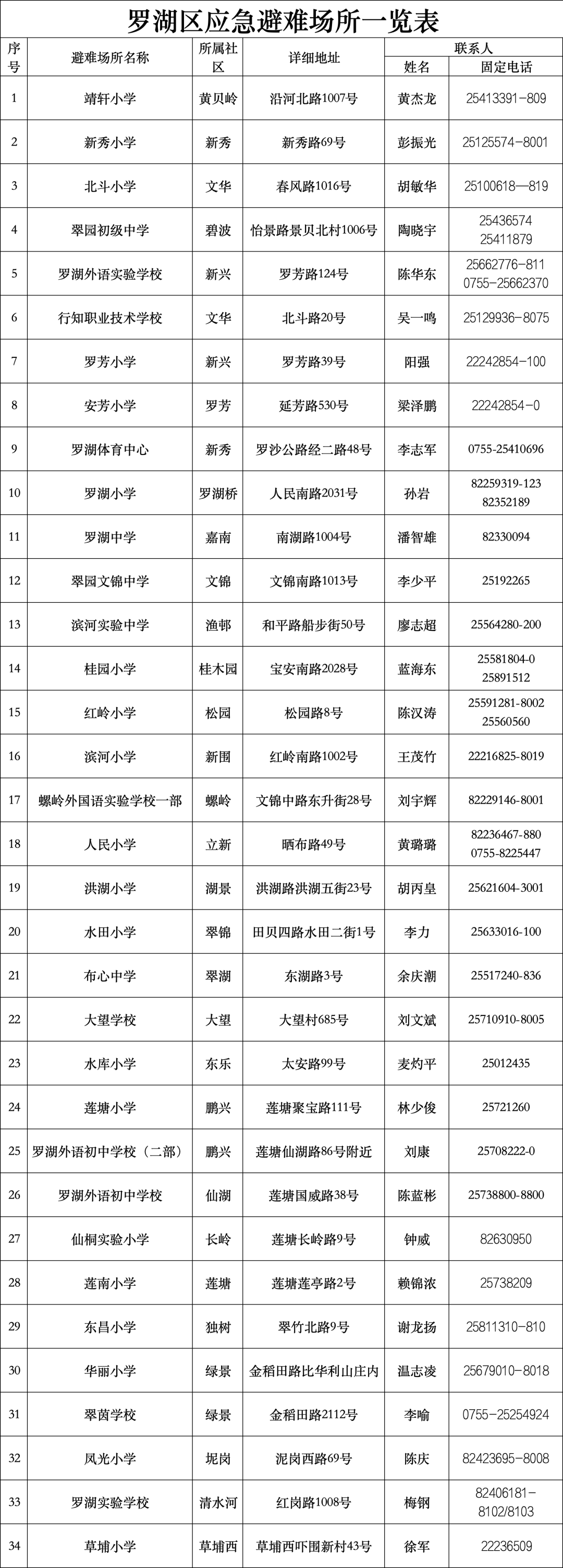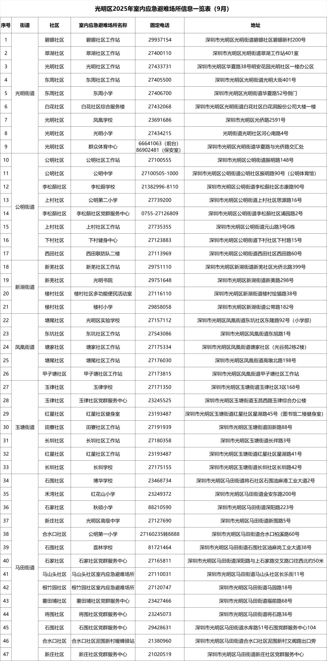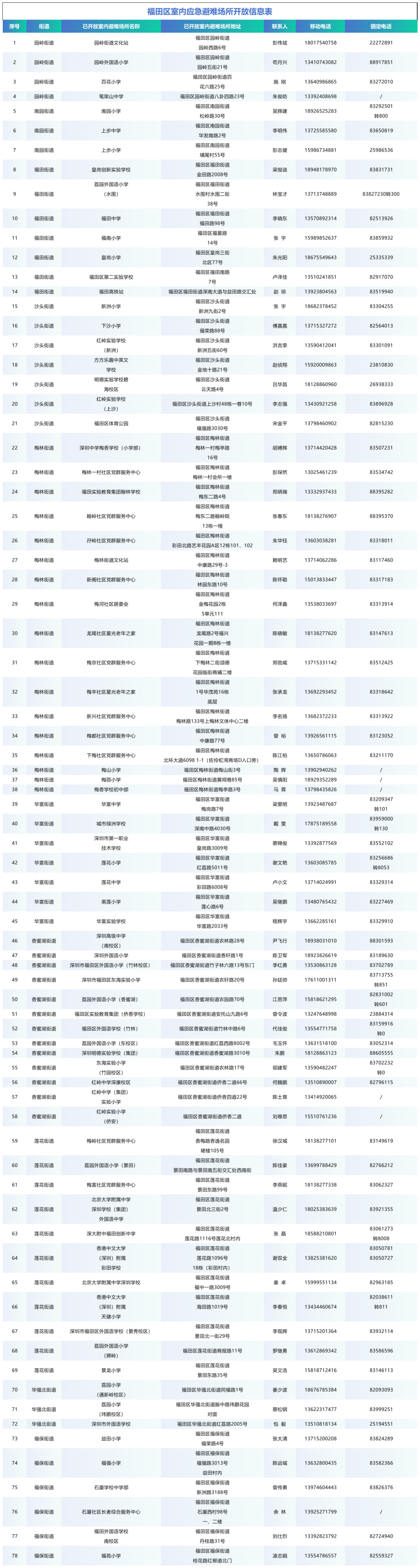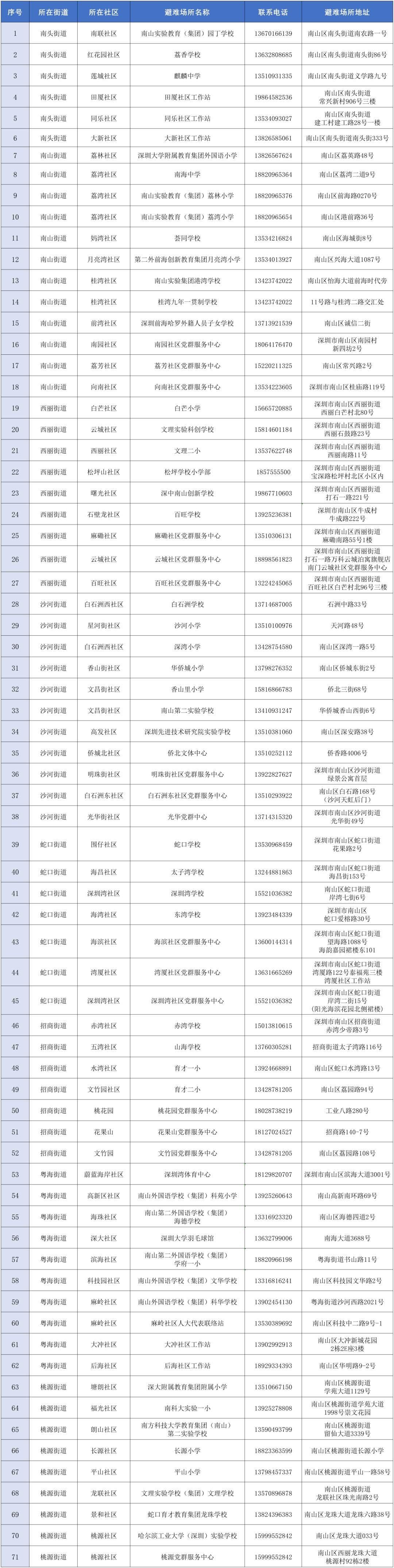 【深圳市室内应急避难场所信息一览表】