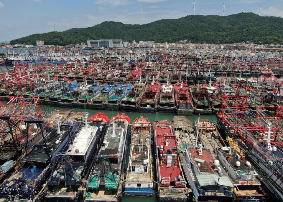 9月23日,广东阳江市海陵岛闸坡渔港停满了归港避风的渔船(无人机照片)。新华社记者 邓华 摄