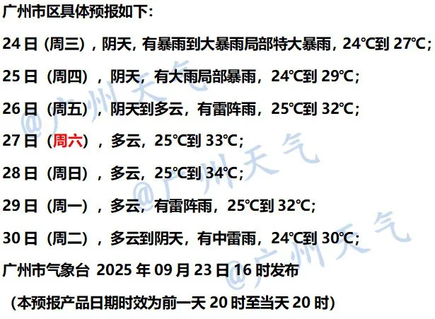 受其影响,23日夜间至25日广州市有暴雨到大暴雨局部特大暴雨。