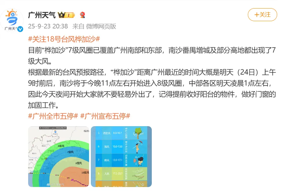 据@广州天气9月23日20时38分消息,目前“桦加沙”7级风圈已覆盖广州南部和东部,南沙番禺增城及部分高地都出现了7级大风。