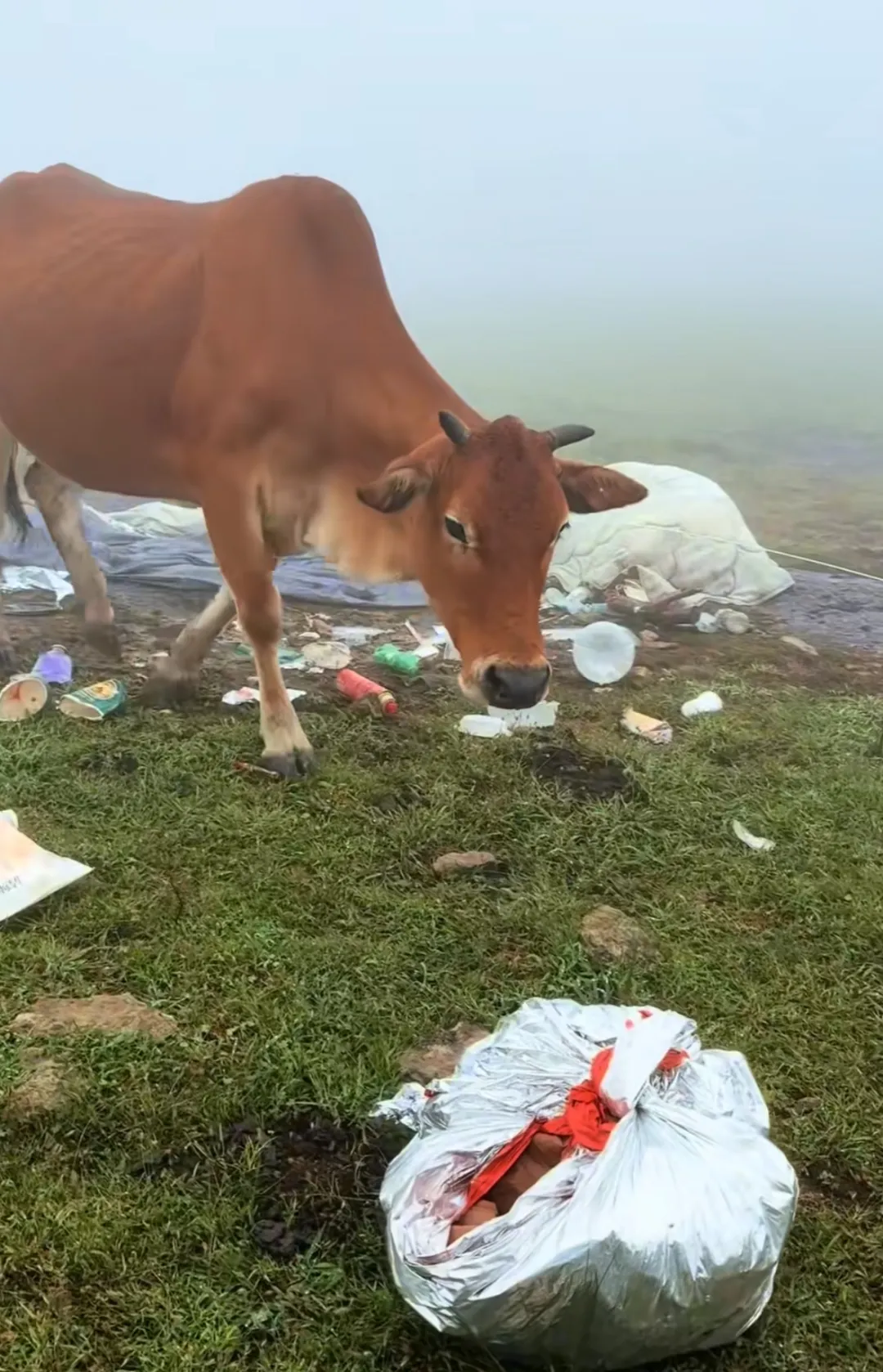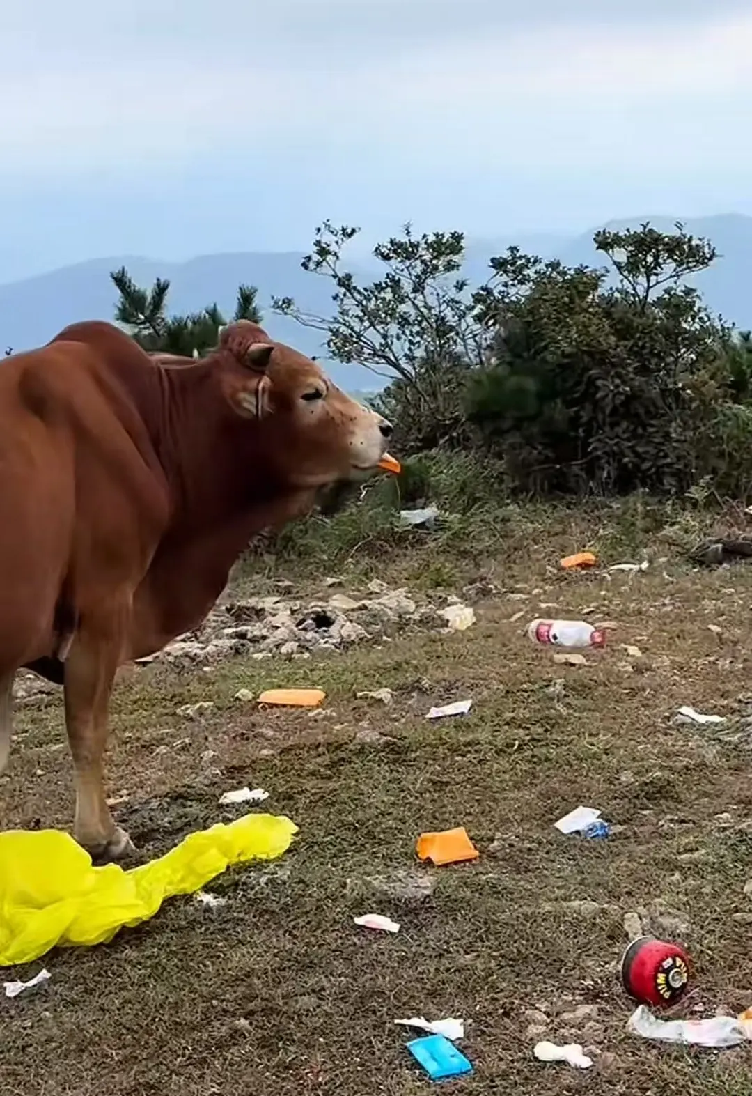 9月23日,有网友发视频称在浙江省台州市大雷山,“山上都是露营的人留下的垃圾,牛牛们就在这边吃垃圾。”视频中在山上一片草地上,遍地垃圾,有牛在咀嚼橙色塑料袋。根据另一网友的视频,大雷山上有大量游客留下的帐篷、塑料袋等。